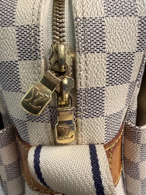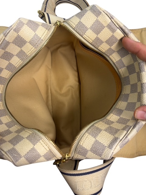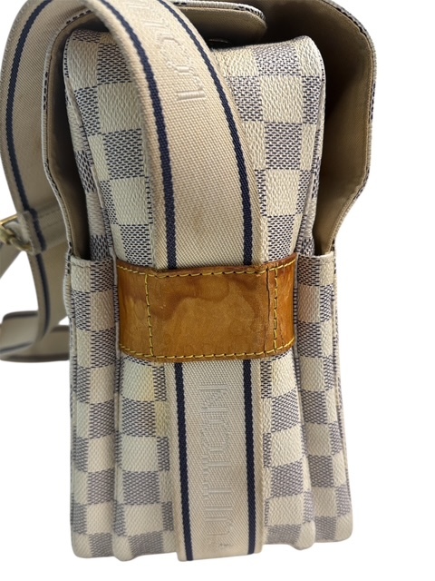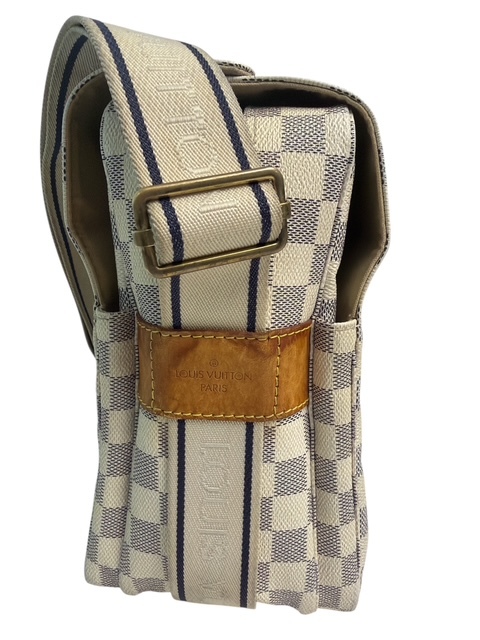 This is an authentic LOUIS VUITTON Damier Azur Naviglio Bag. This versatile messenger is crafted of signature damier canvas in ivory and azur blue with natural vachetta leather trim and external wide pockets. The top features short flaps that unsnap to reveal a top zipper. The interior is lined with a durable ivory canvas and features a pocket. The adjustable cotton canvas shoulder strap features Louis Vuitton signature lettering. This is an excellent bag for both casual or professional use, and will take you from work to errands with effortless style, from Louis Vuitton!
