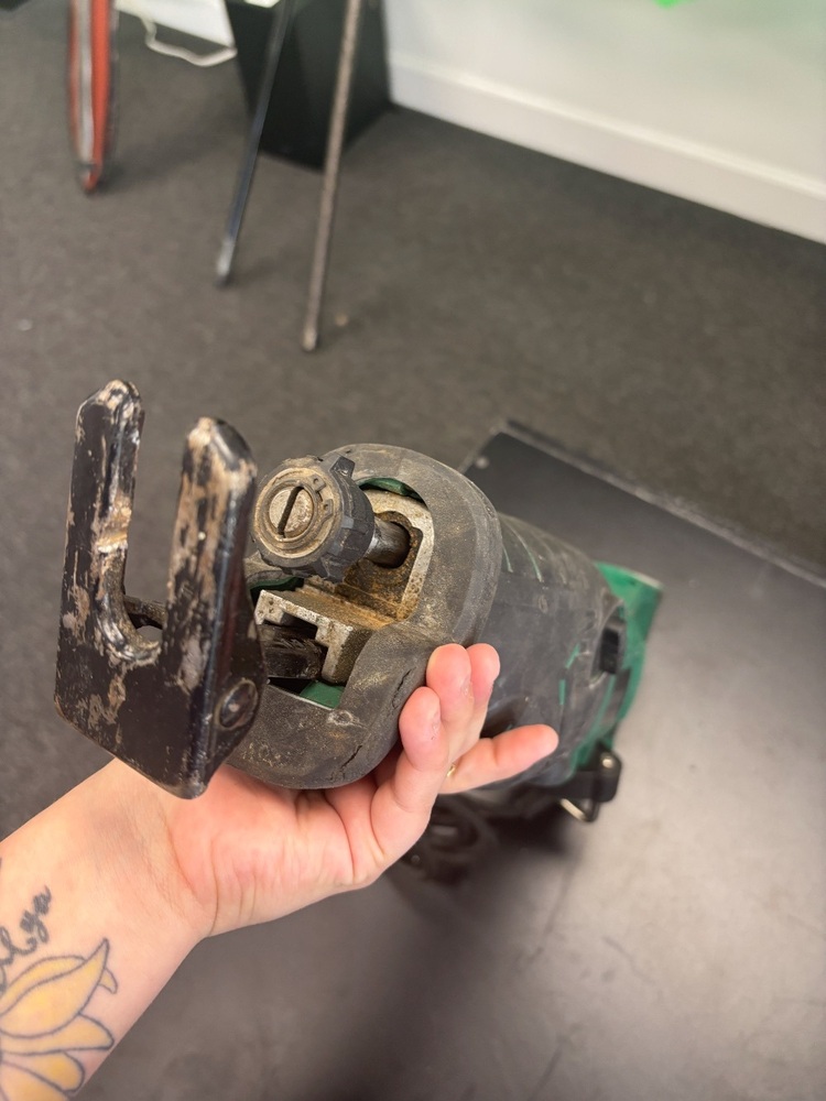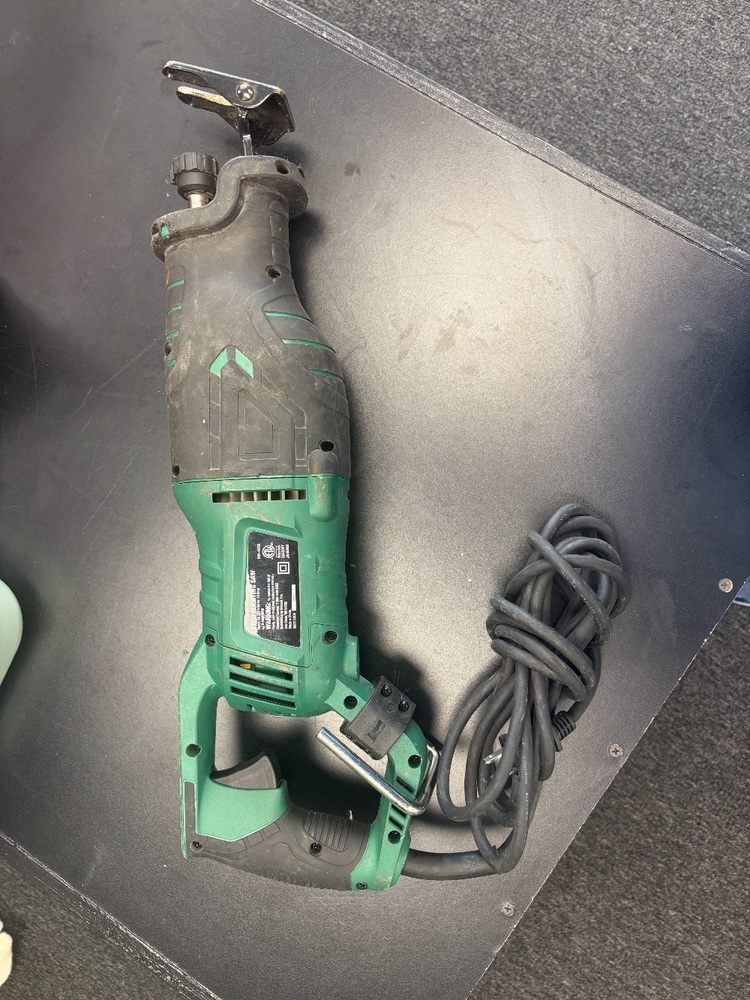 This reciprocating saw was previously owned. It shows signs of normal use. It is in fair condition. It has been tested and works. There is rust on the front of the saw. There is some white residue on the black rubber part of the tool.