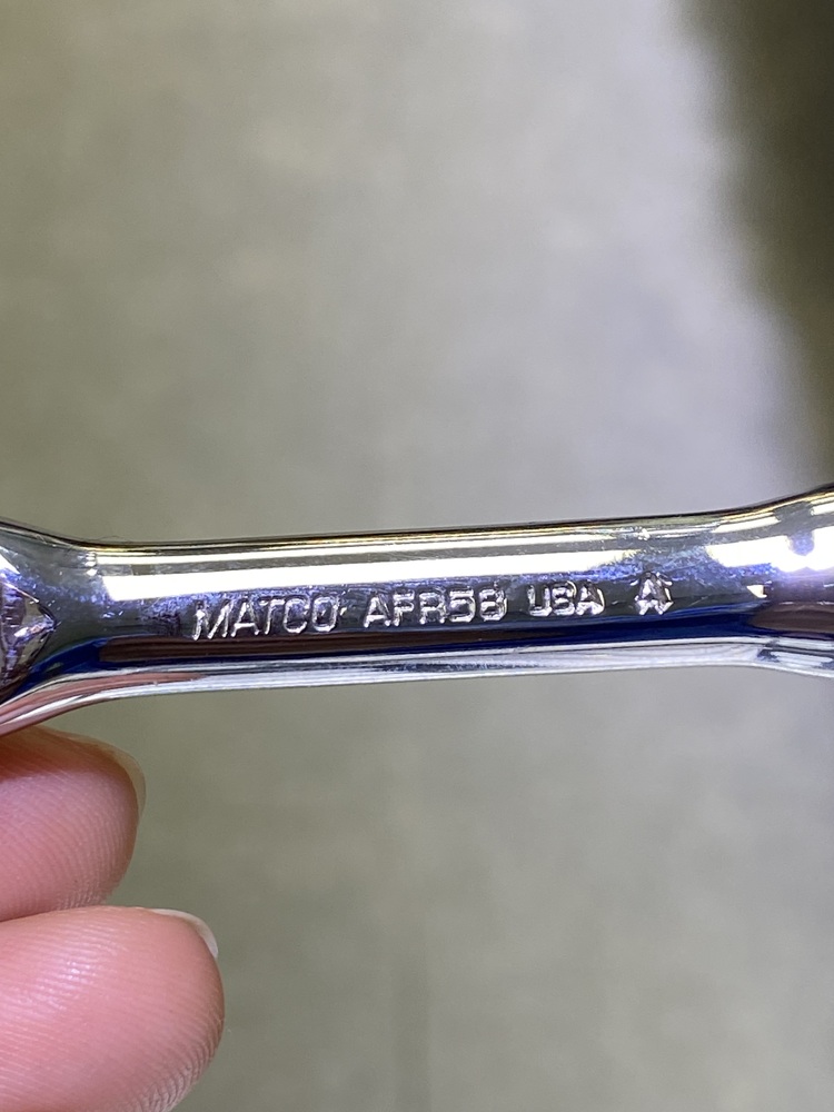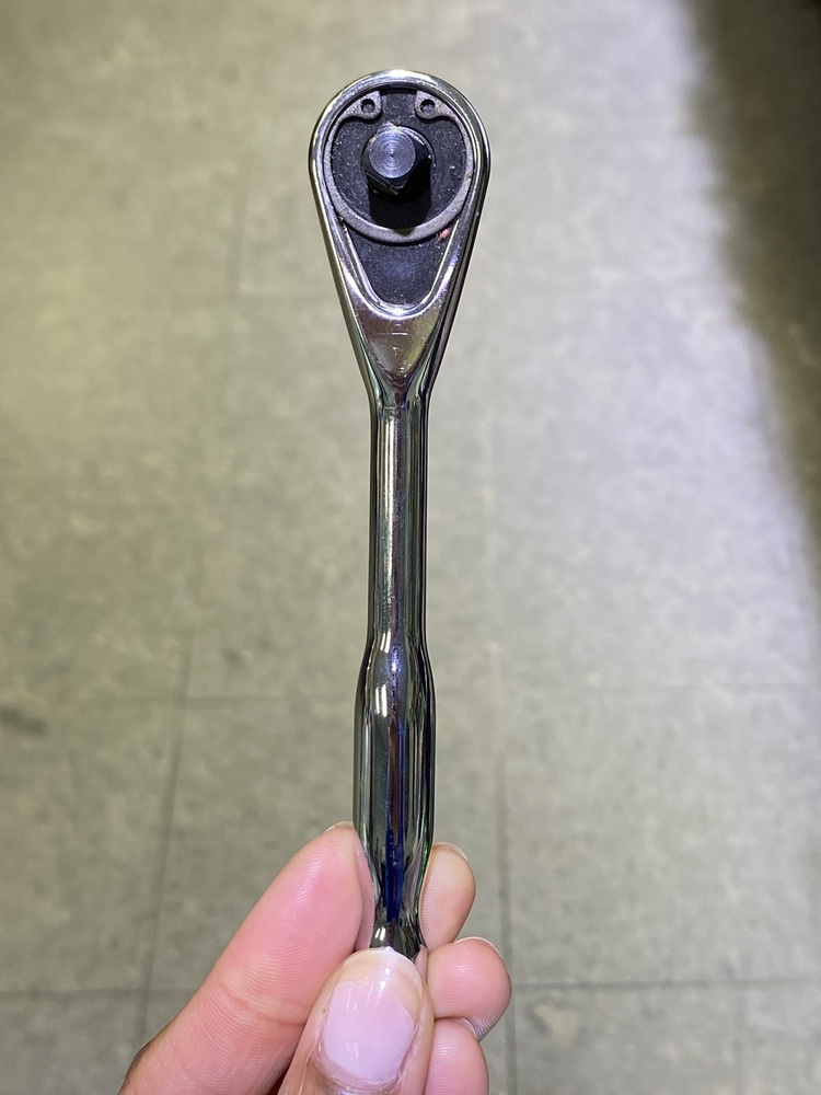This Matco 1/4 inch drive ratchet, part number AFR58GE, features a smooth 88 tooth ratcheting mechanism, allowing use in tight spaces with narrow angles of movement. It comes with a high quality chrome finish, hardened tool steel anvil with spring detent for socket retention, and a snap ring retaining the mechanism, allowing for easy disassembly and maintenance. This particular ratchet has initials engraved into it, including light scuffing on the finish, but is fully functional and an excellent addition to any basic tool set