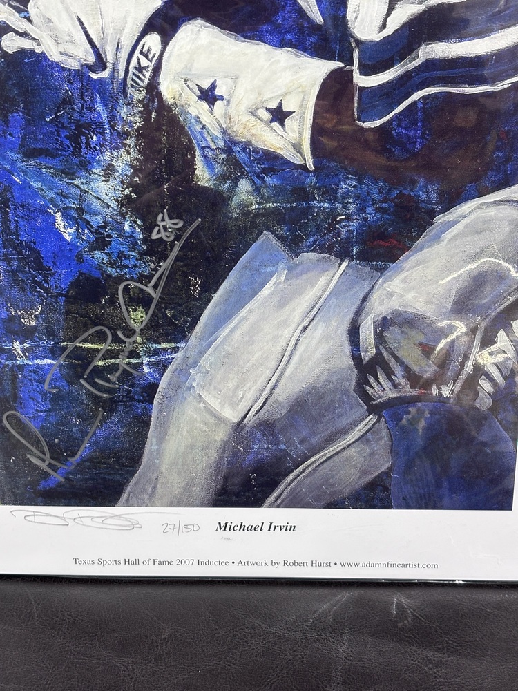 Own a stunning piece of football history with this Michael Irvin autographed fine art print. This collectible artwork captures the Hall of Famer in iconic form and includes his handwritten signature, making it a standout addition for any Dallas Cowboys fan or sports memorabilia collector.