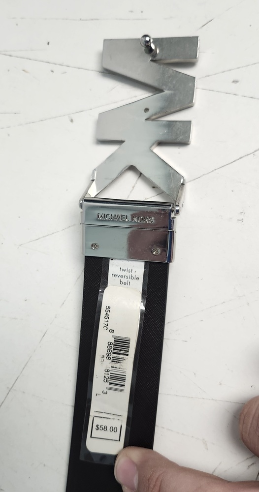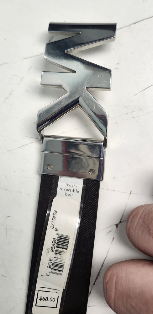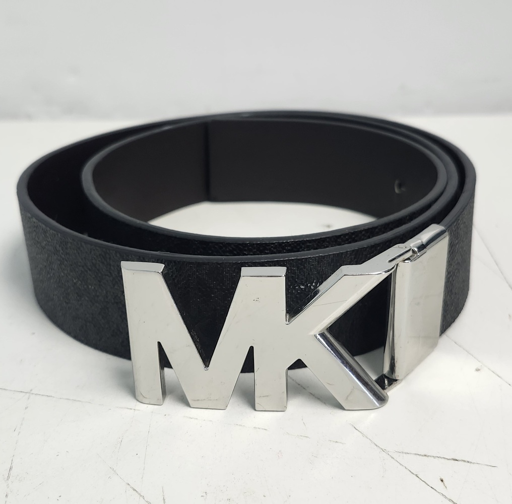 Reversible Michael Kors belt with MK logo buckle. Belt is Size L and is 34" long. Plain black on one side with MK logo print on the other.