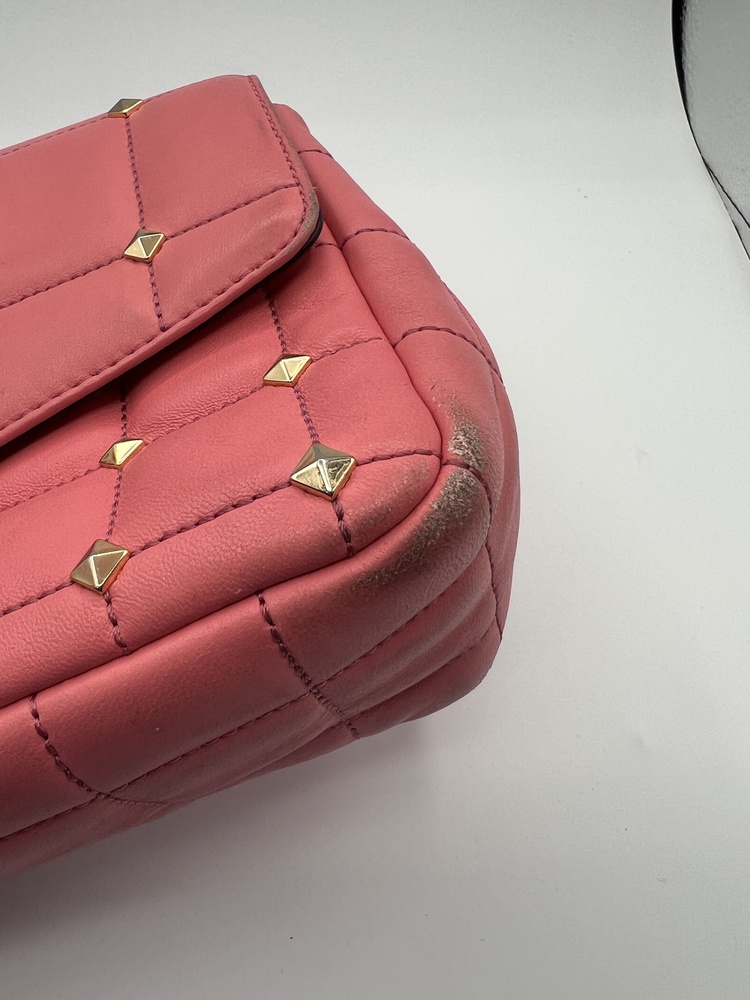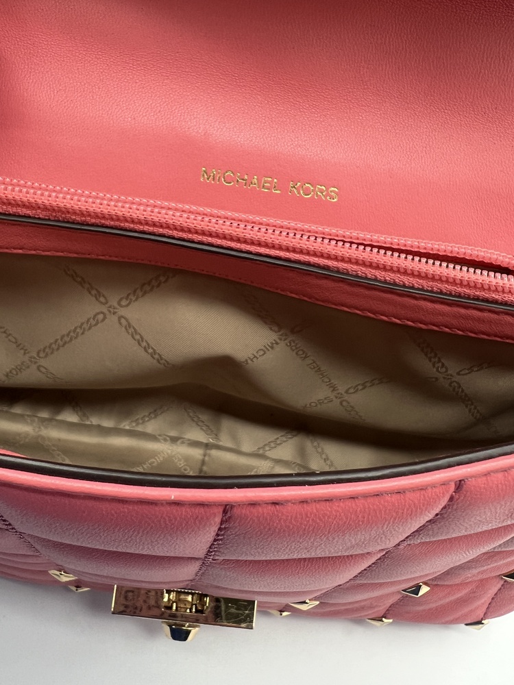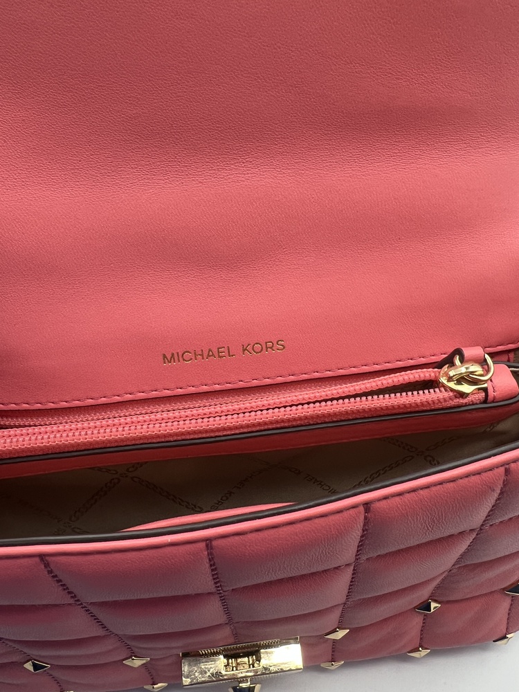 This listing is for a gorgeous Michael Kors pink quilted shoulder bag featuring gold-tone hardware and studded detailing. With its elegant padded design, gold chain strap, and signature MK lock closure, this bag adds a bold pop of color while keeping a classy, high-end look.