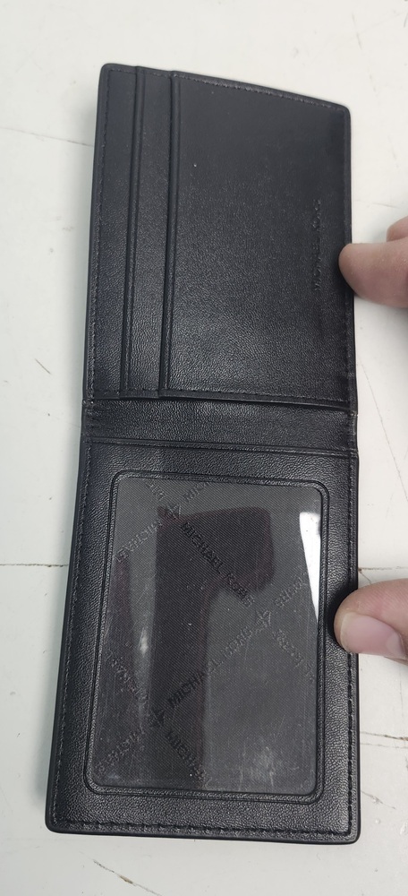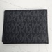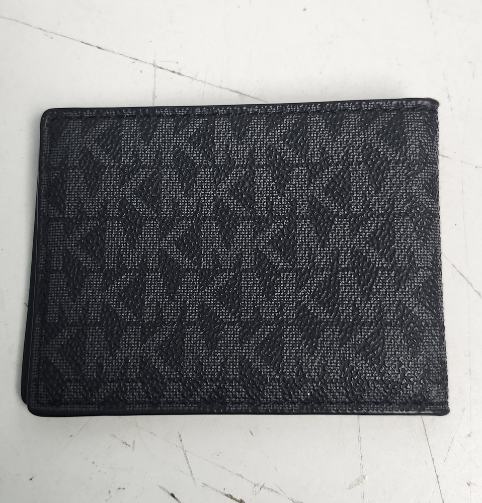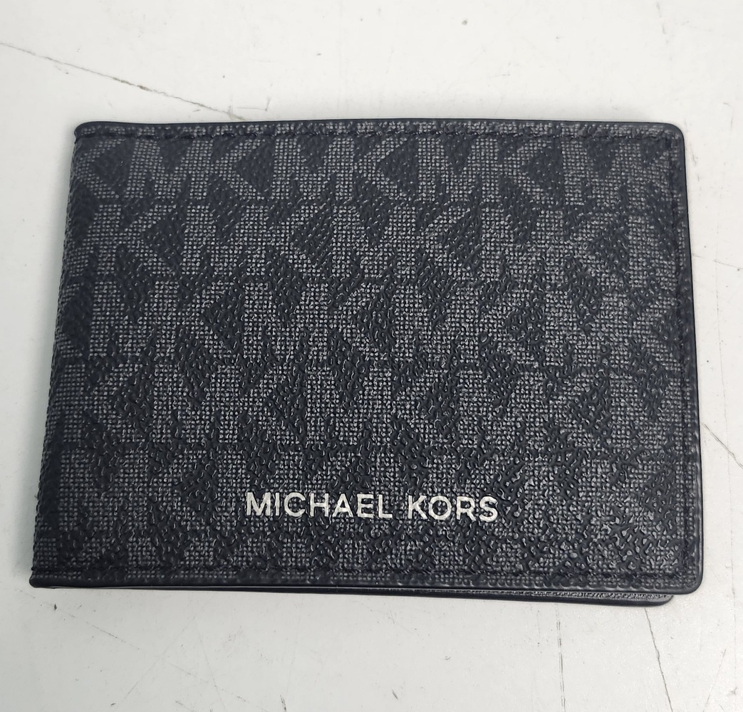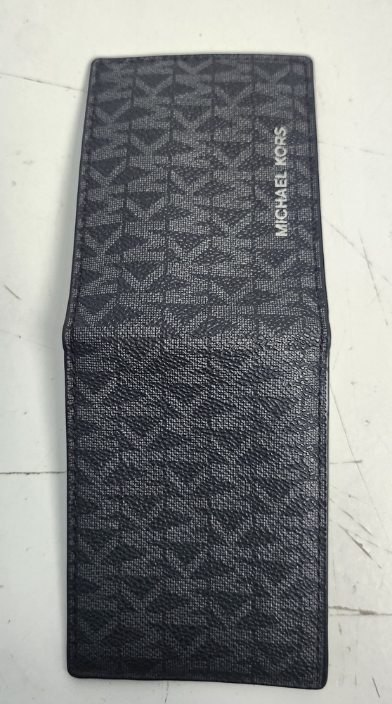 Michael Kors men’s bifold wallet in black MK Signature coated canvas. Slim design with multiple card slots, a clear ID window, and a full bill compartment. Interior is clean and well kept. All stitching intact.