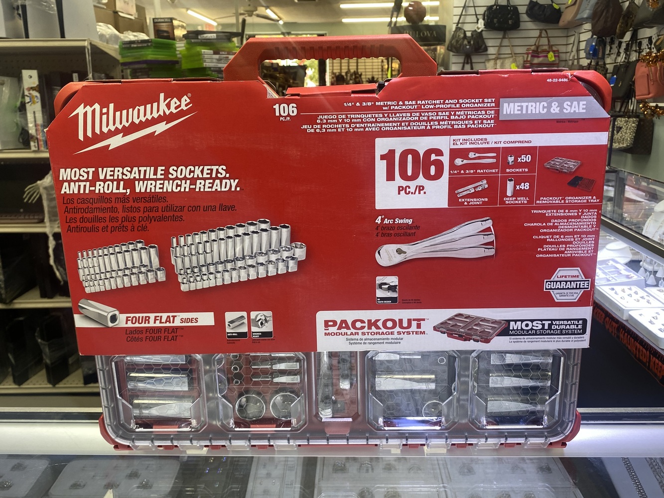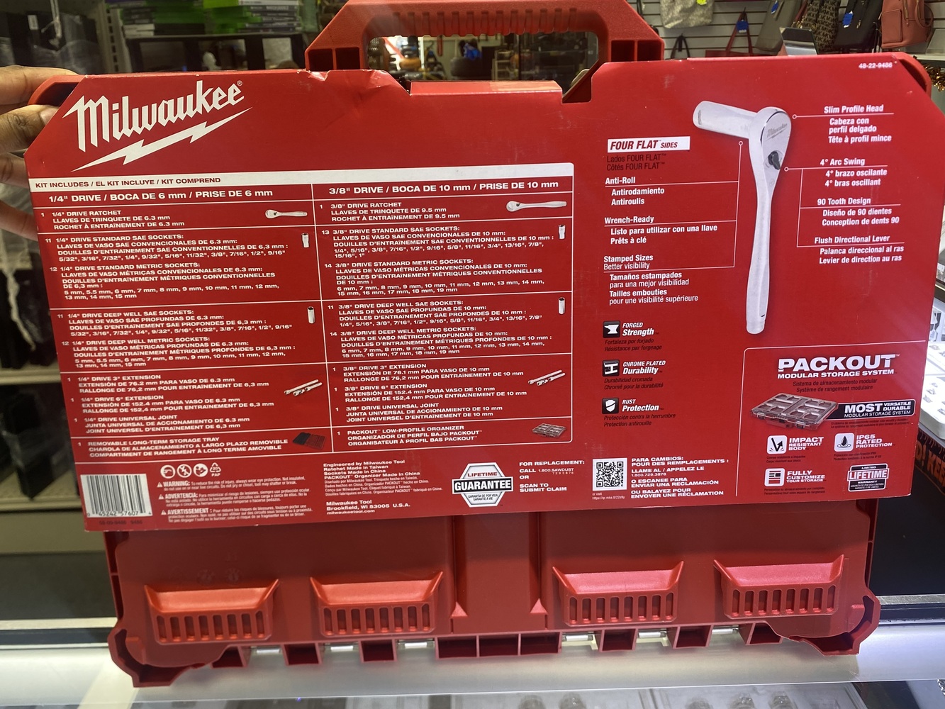 Our Ratchet and Socket Set features sockets that have FOUR FLAT Sides that deter rolling and are wrench compatible for maximum productivity. The 90-tooth ratchet tool provides 4° of arc swing and a slim profile for work in tighter spaces. We’ve stamped the sizes into each socket for easy-to-read visibility. You can keep both the SAE & Metric 56-piece ?” and 50-piece ¼” Drive Ratchet and Socket Sets organized in the included PACKOUT™ Low-Profile Organizer equipped with a clear top for easy identification of parts at a glance. This PACKOUT Organizer is IP65 rated and built from impact-resistant materials for durability on and off the jobsite with a reinforced hinge and heavy-duty latches. The Compact Low-Profile Organizer is part of the MILWAUKEE PACKOUT Modular Storage System, allowing you to custom-build storage systems to easily transport and organize your tools and accessories. This Combo Kit includes 106 total pieces: a 56 Piece 3/8 in. Drive Ratchet and Socket Set (48-22-9008), a 50 Piece 1/4 in. Drive Ratchet and Socket Set (48-22-9004), and a PACKOUT™ Low-Profile Organizer (48-22-8431).