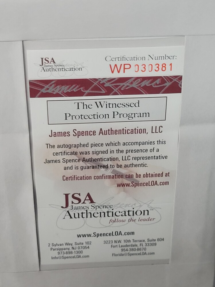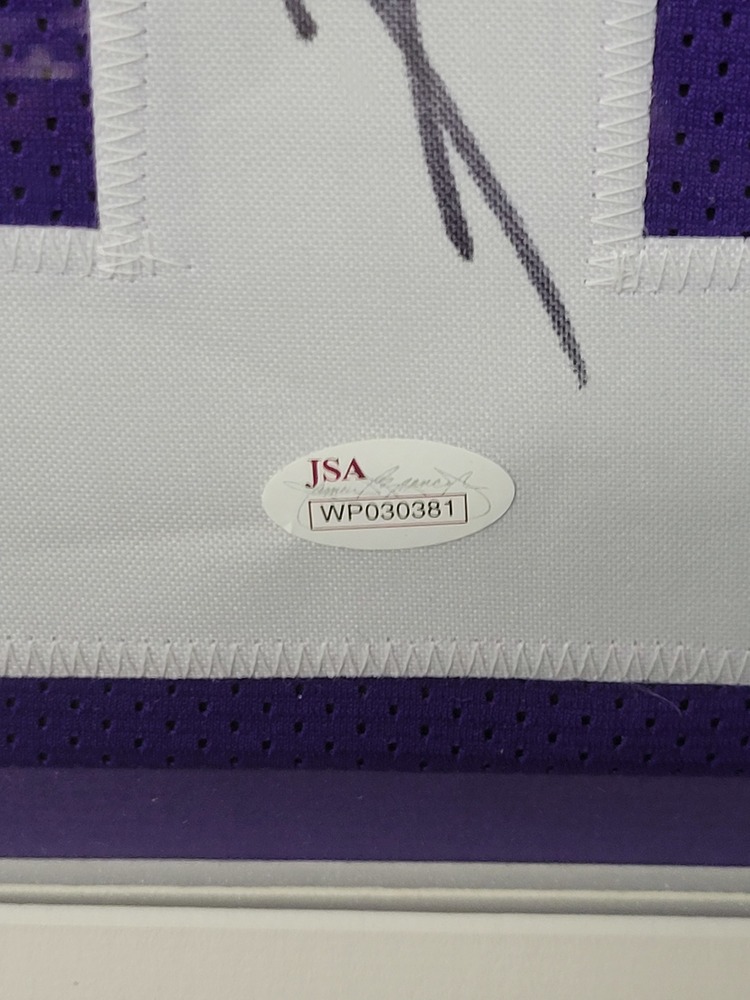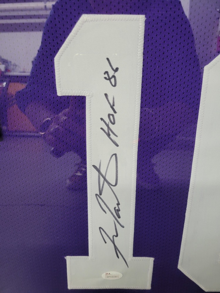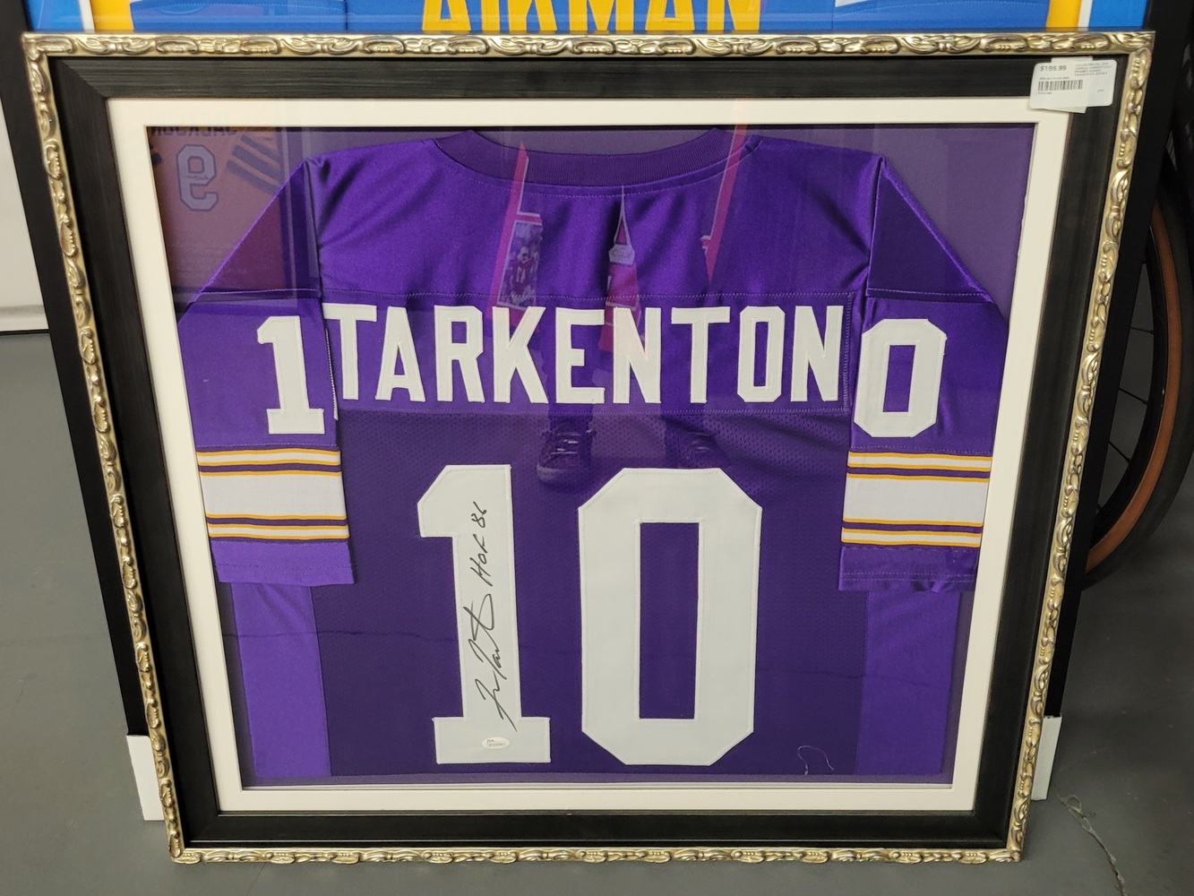 Fran Tarkenton autographed Minnesota Vikings jersey with HOF ‘86 inscription, professionally framed and ready to hang. Comes with JSA Witnessed Protection Program certification (Cert #WP030381), so the signature is guaranteed authentic.