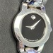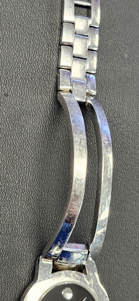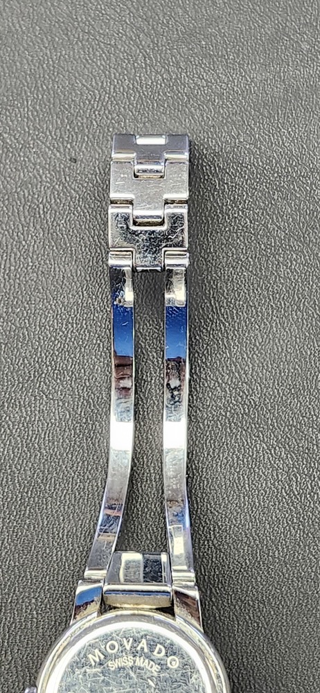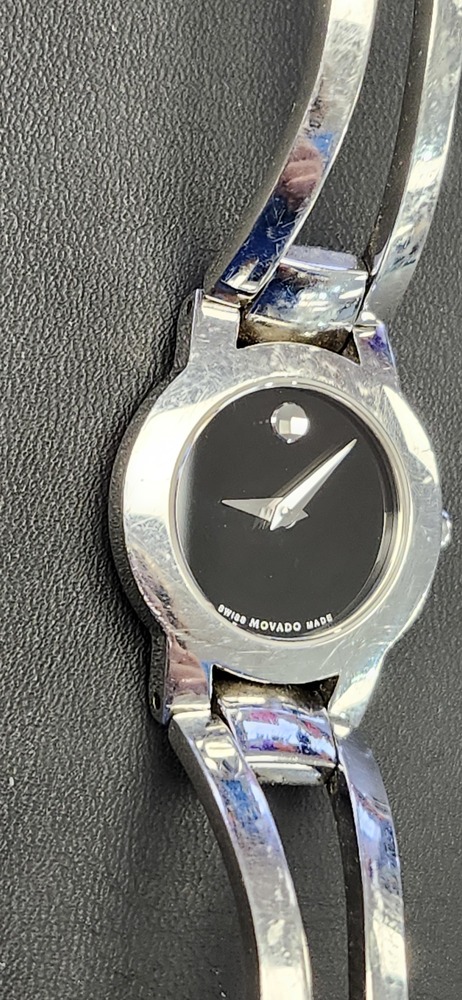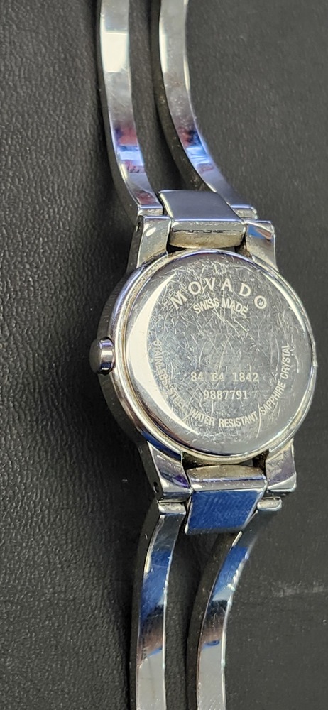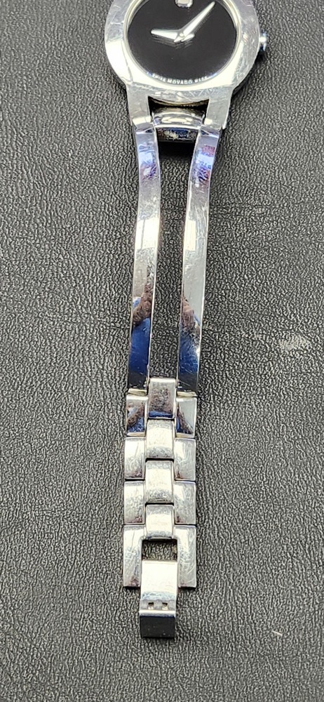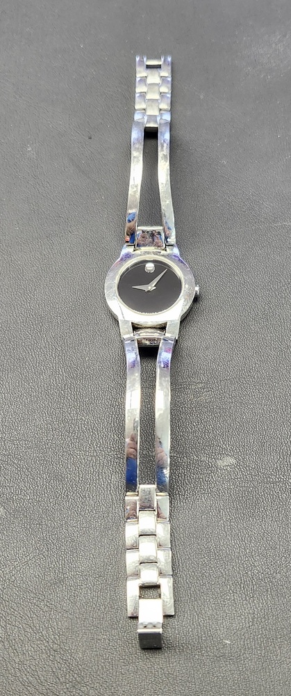 Genuine Movado women’s Museum watch, model 84 E4 1842. Classic black dial with silver hands and dot marker. Swiss made stainless-steel case and band.