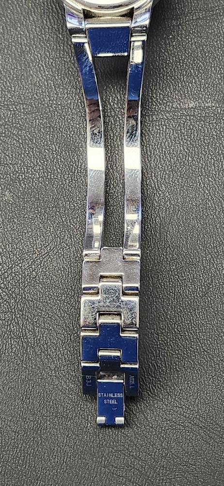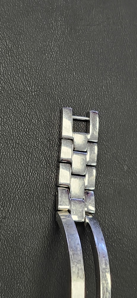 Used – shows scratches and scuffs on case, crystal, and bracelet from normal wear. Band has some tarnish near lugs. NEEDS NEW BATTERY
