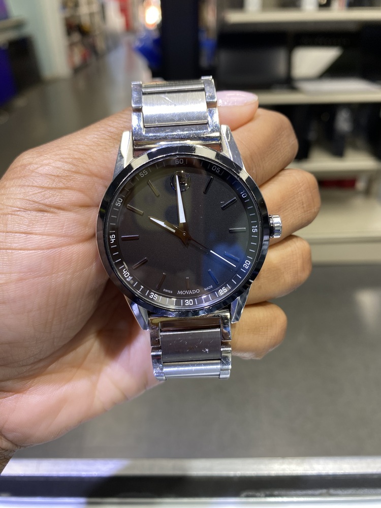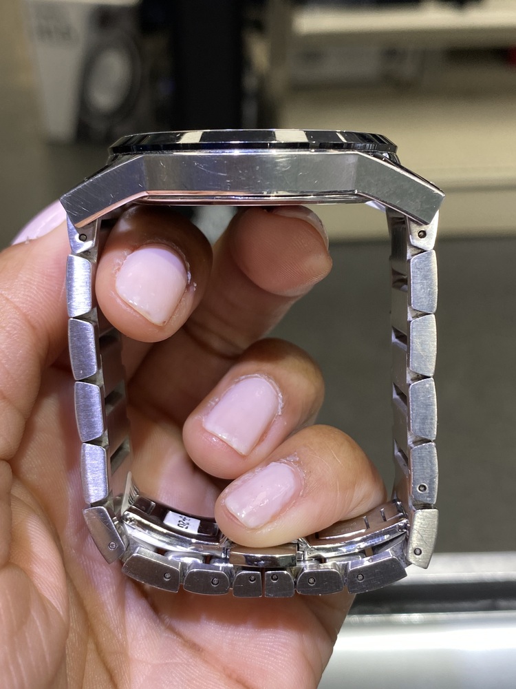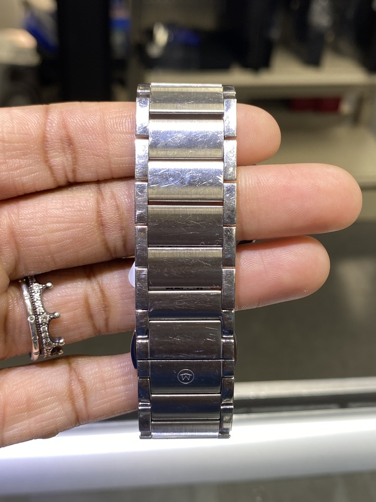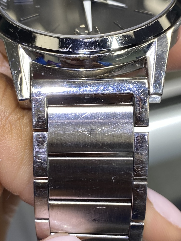 This watch is in good working condition. There aren"t any scratches in the crystal. There are small scratches on the stainless steal band. It does not come with a box or extra links.