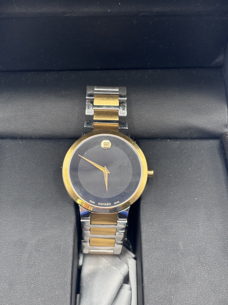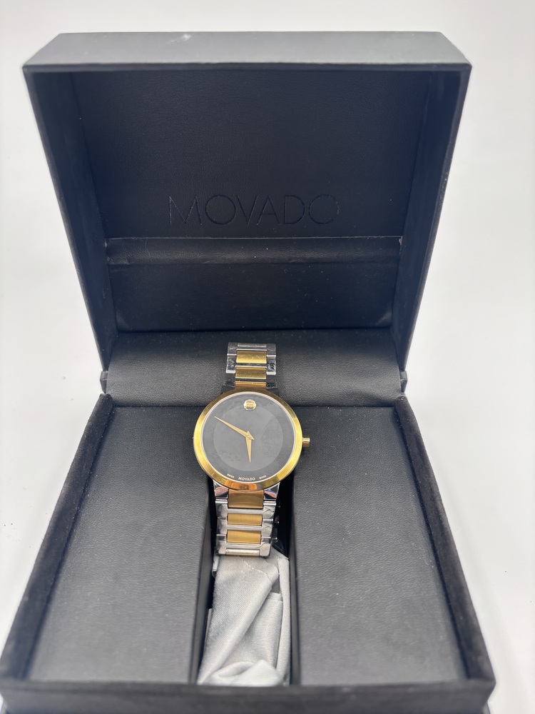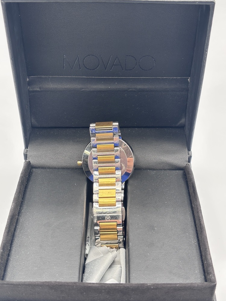 Elevate your style with this authentic Movado Modern Classic Two-Tone Watch, a sleek and timeless piece featuring the iconic Movado Museum-style design. This watch is pre-owned and shows visible signs of wear, but remains fully functional with a classic look suitable for everyday use or dress occasions.