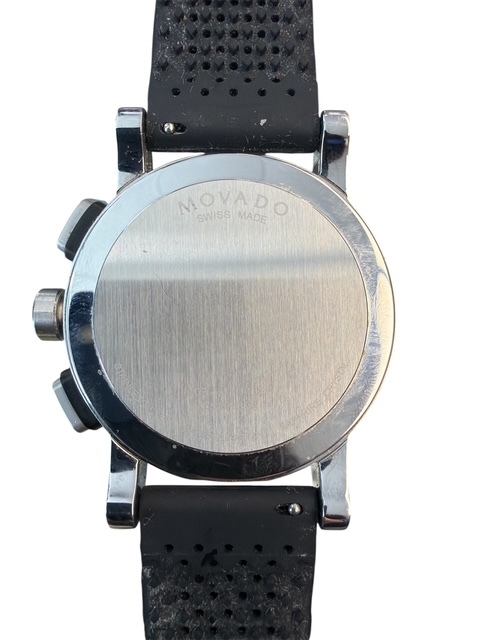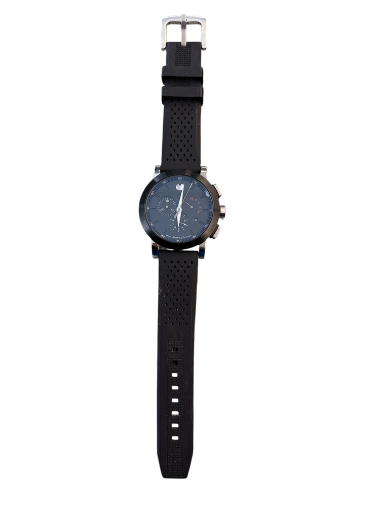 | The Movado Sapphire Crystal Sport Watch features a sleek, all-black design with a durable rubber band. This watch boasts Swiss quartz movement, a scratch-resistant sapphire crystal face, luminous hands for easy reading, and water resistance up to 30 meters, ideal for sporty, active wearers. |
