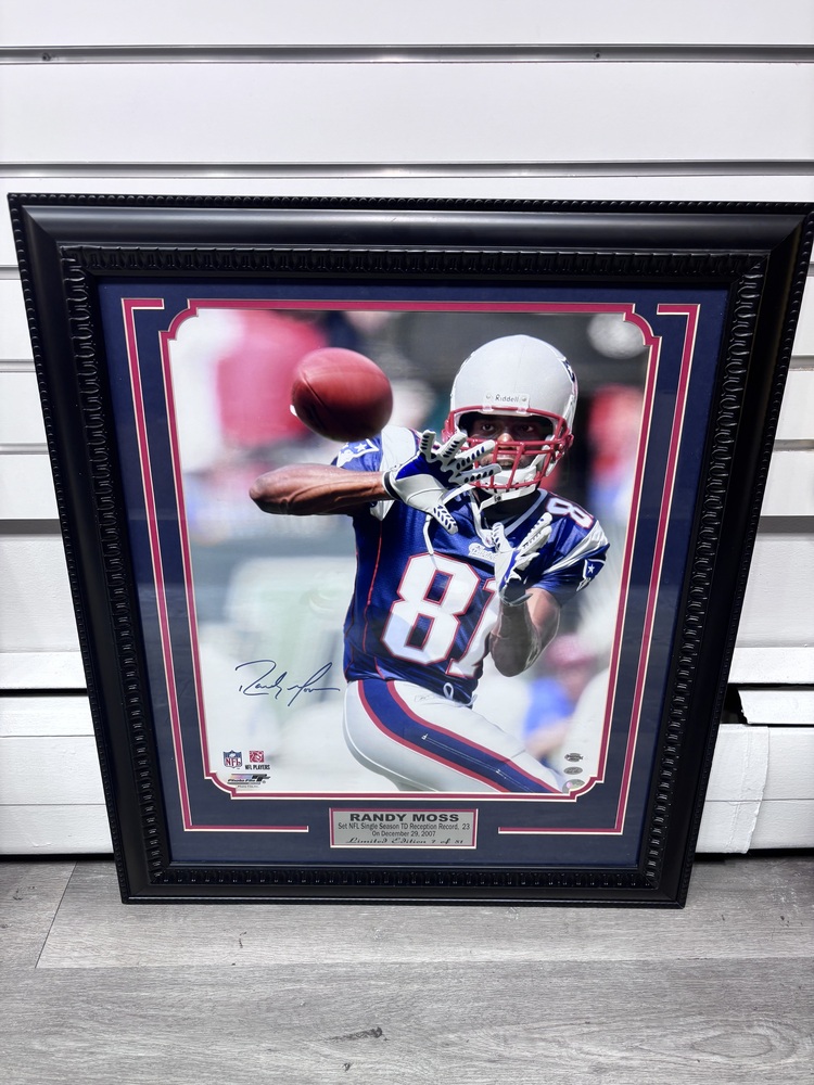 NFL Randy Moss Set Single Season TD Reception Record, 23 On December 29, 2007 On a 16 x 20 Frame Signed With Certificate Of Authenticity.