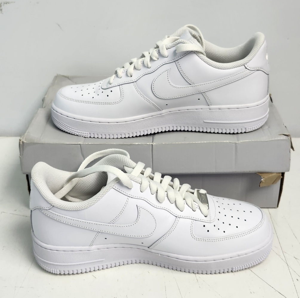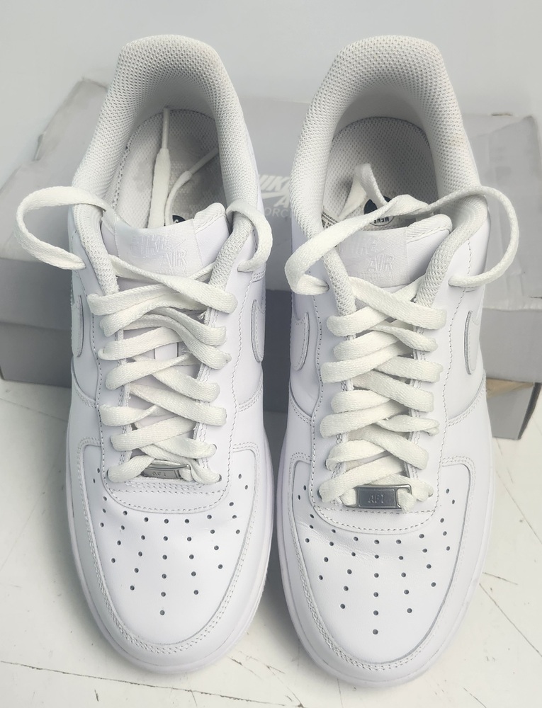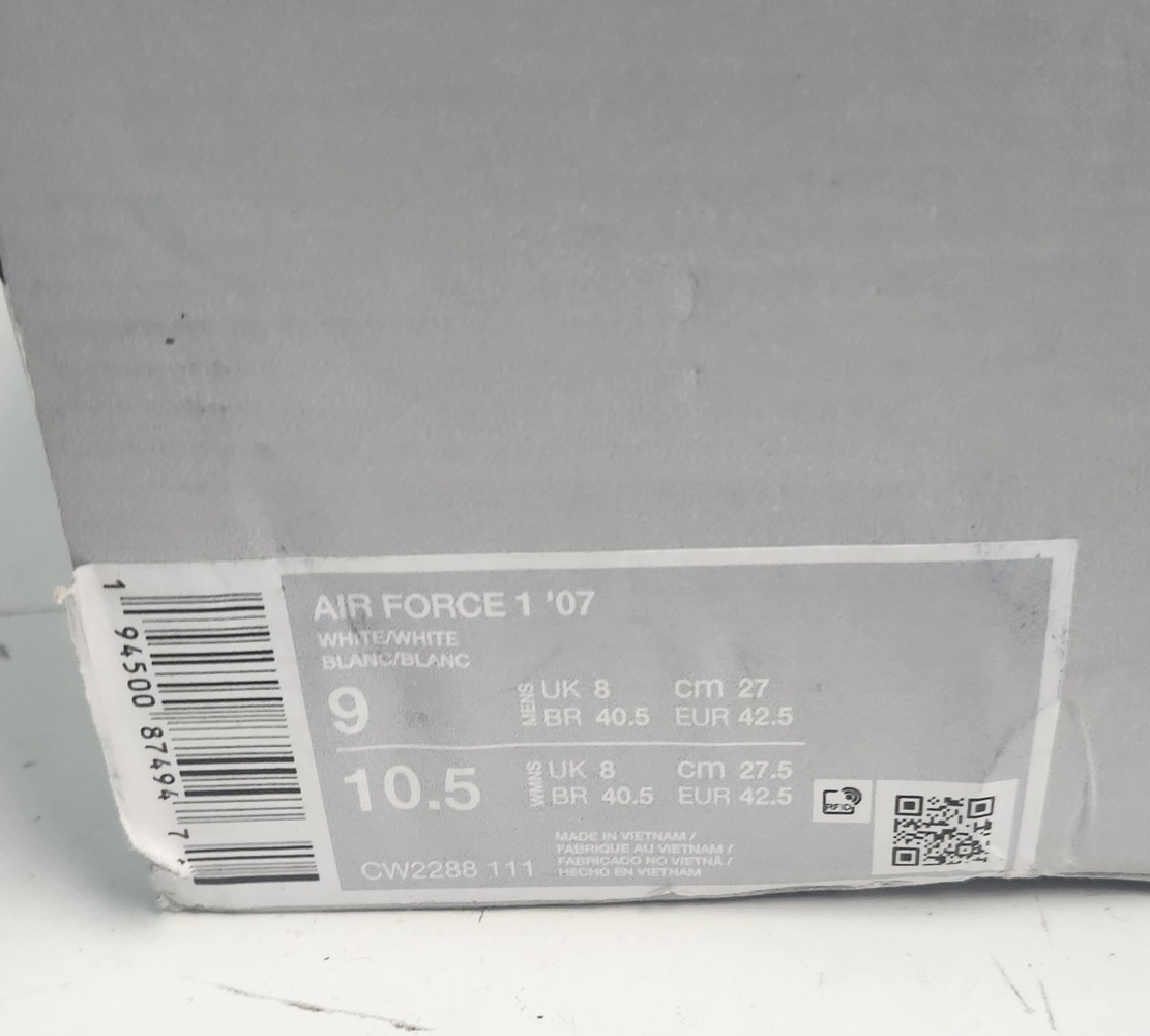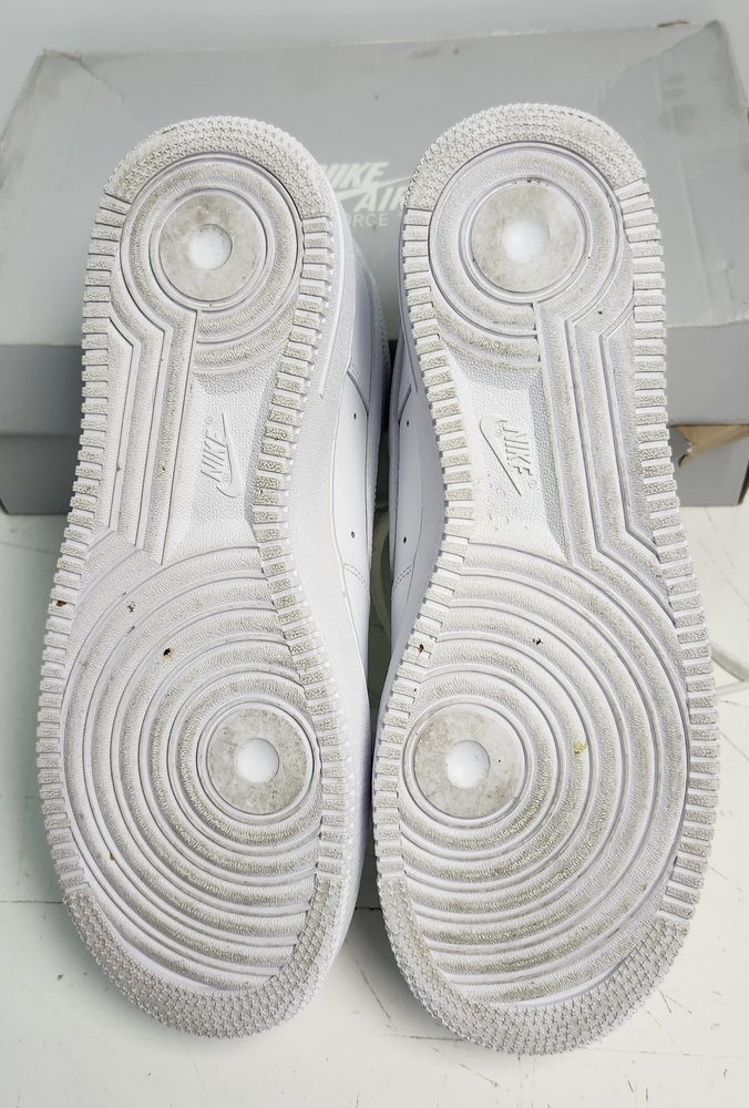 Nike Air Force 1 ’07 low-top sneakers in classic all-white. Men’s size 9 with leather uppers and traditional AF1 design. Shoes show minor outsole wear consistent with light use and are otherwise well kept. Includes original Nike box.
