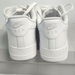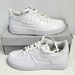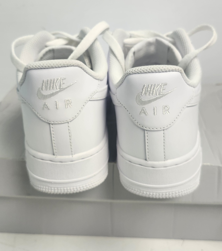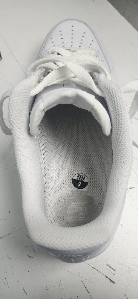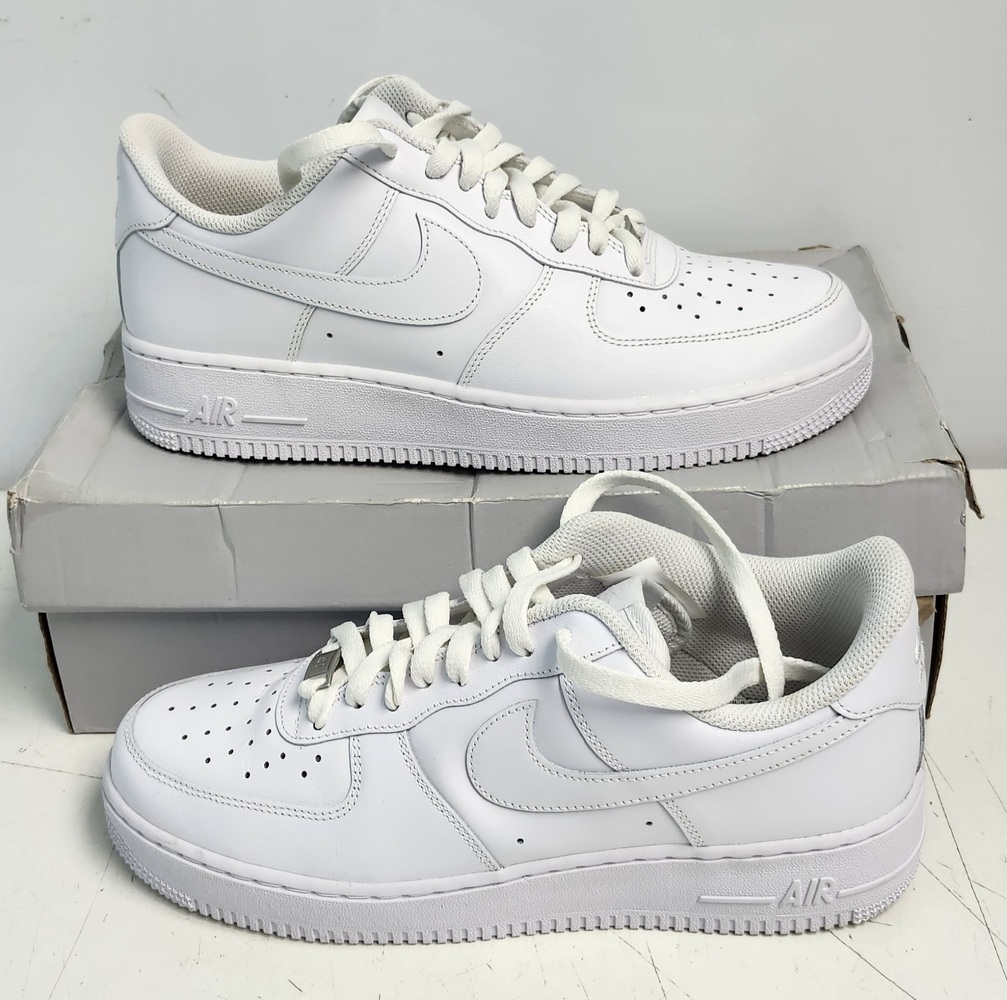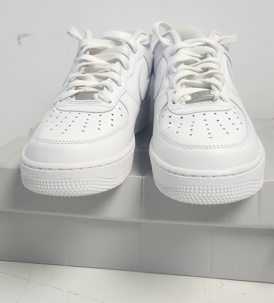 Nike Air Force 1 ’07 low-top sneakers in classic all-white. Men’s size 9 with leather uppers and traditional AF1 design. Shoes show minor outsole wear consistent with light use and are otherwise well kept. Includes original Nike box.