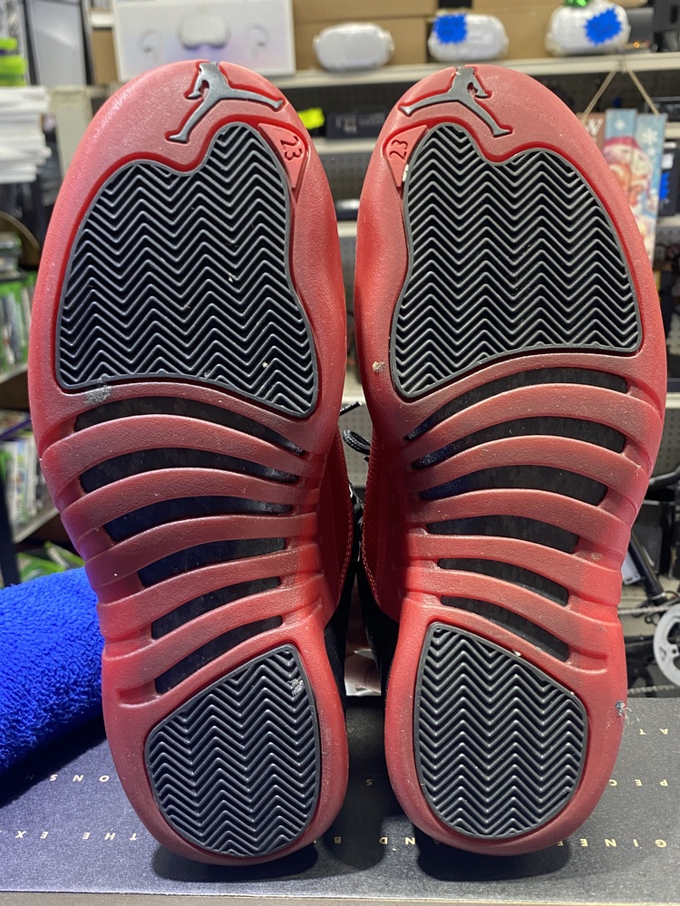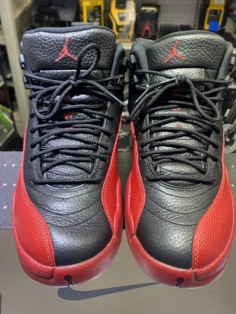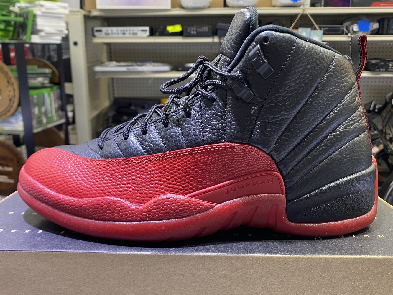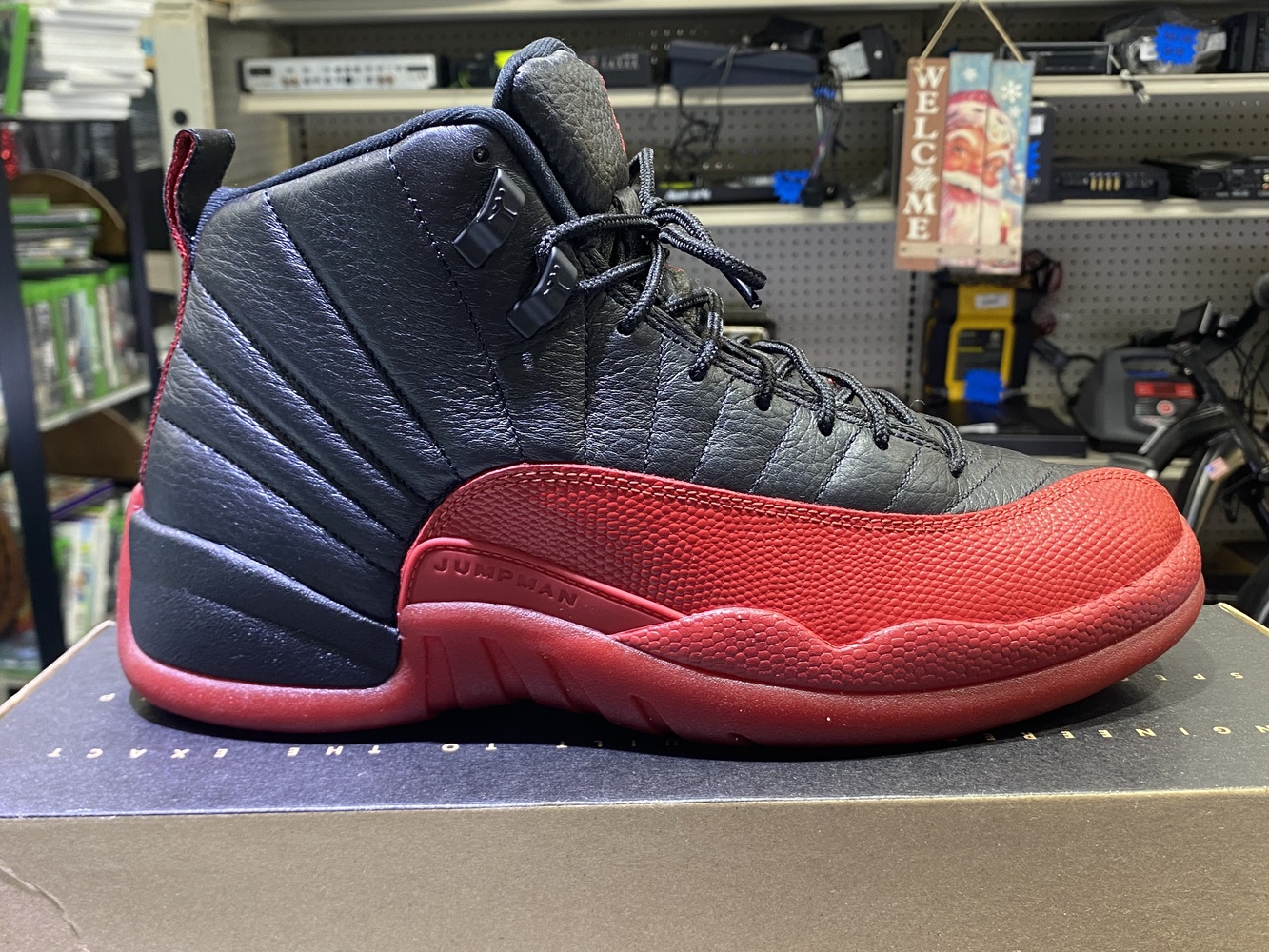 The 2025 edition of the Air Jordan 12 Retro 'Flu Game' brings back the shoe that Michael Jordan famously wore during Game 5 of the 1997 NBA Finals. Radiating stitch lines decorate the black tumbled leather upper, contrasted by lizard-textured overlays in Varsity Red. Jumpman branding appears on the tongue and heel tab. Performance benefits include a lightweight Phylon midsole with full-length Zoom Air cushioning. Underfoot, the semi-translucent red rubber outsole features black herringbone traction pods and an exposed carbon fiber shank plate.