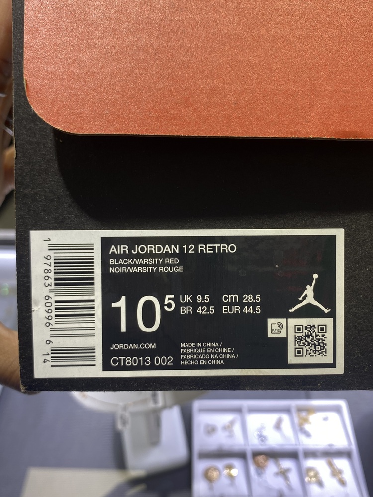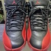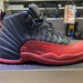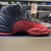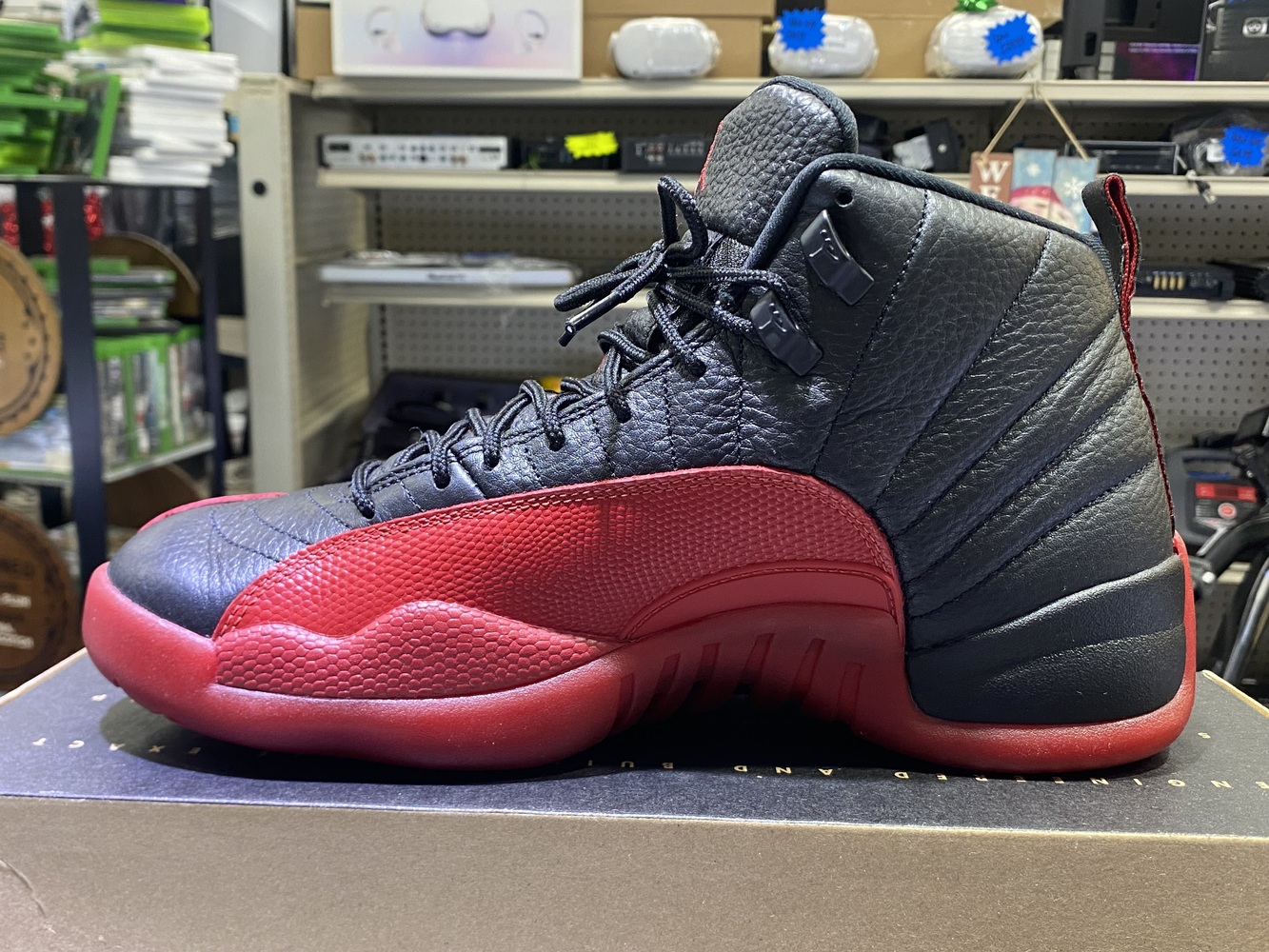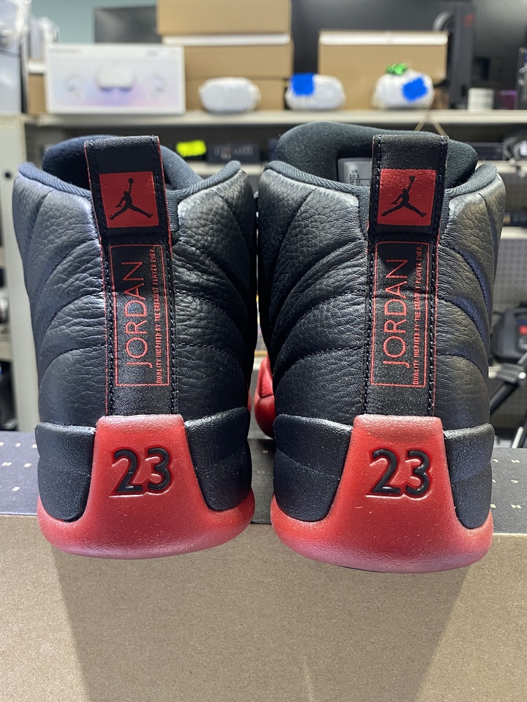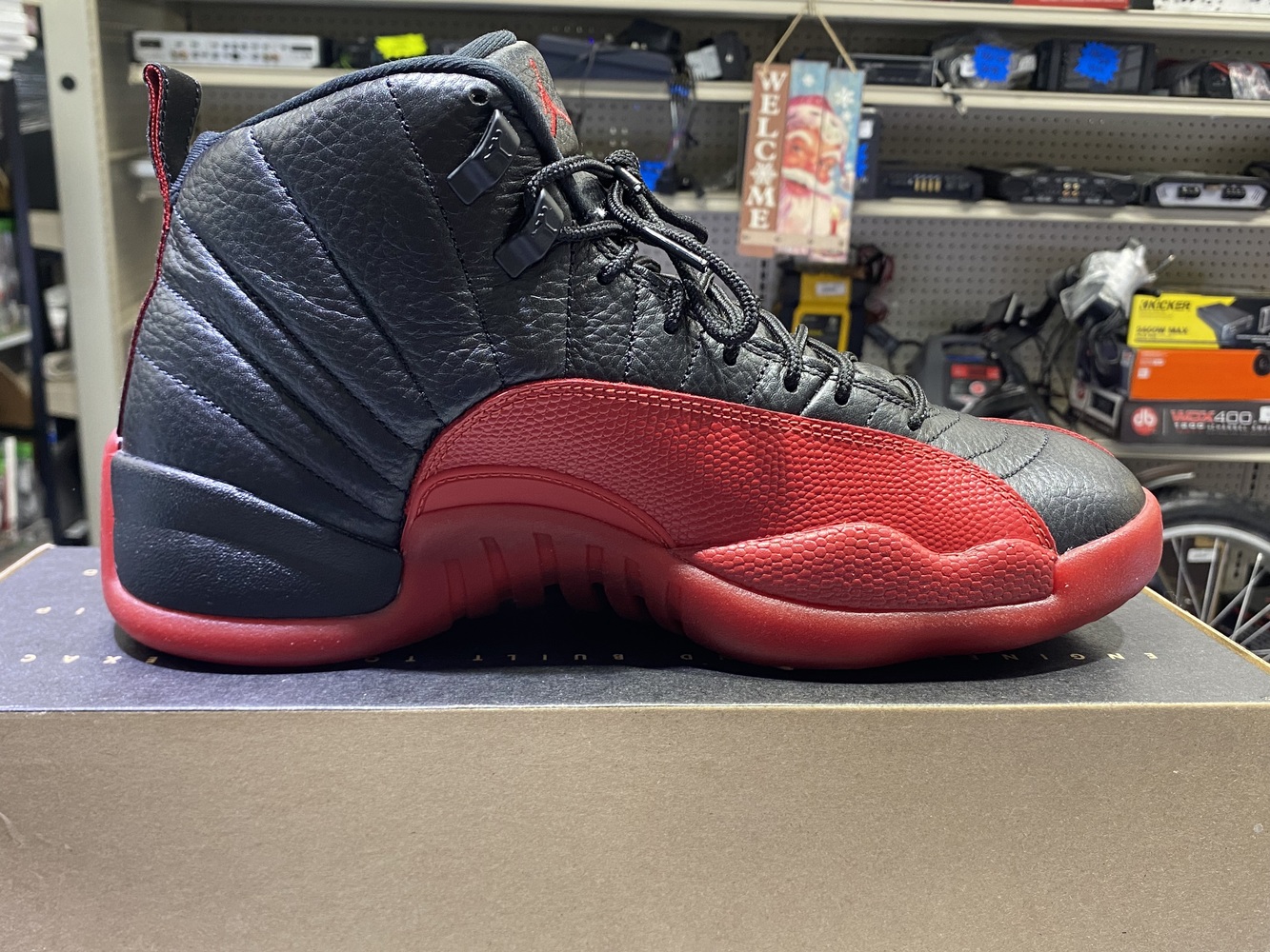 The 2025 edition of the Air Jordan 12 Retro 'Flu Game' brings back the shoe that Michael Jordan famously wore during Game 5 of the 1997 NBA Finals. Radiating stitch lines decorate the black tumbled leather upper, contrasted by lizard-textured overlays in Varsity Red. Jumpman branding appears on the tongue and heel tab. Performance benefits include a lightweight Phylon midsole with full-length Zoom Air cushioning. Underfoot, the semi-translucent red rubber outsole features black herringbone traction pods and an exposed carbon fiber shank plate.