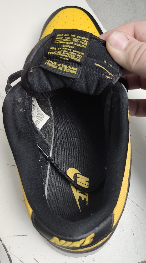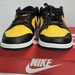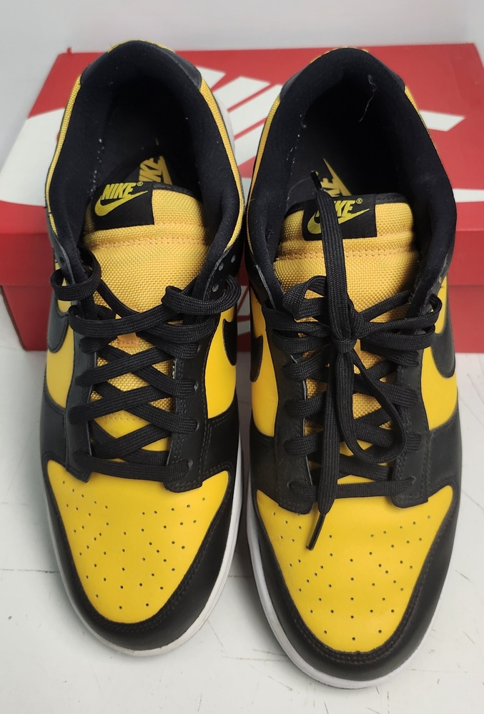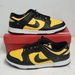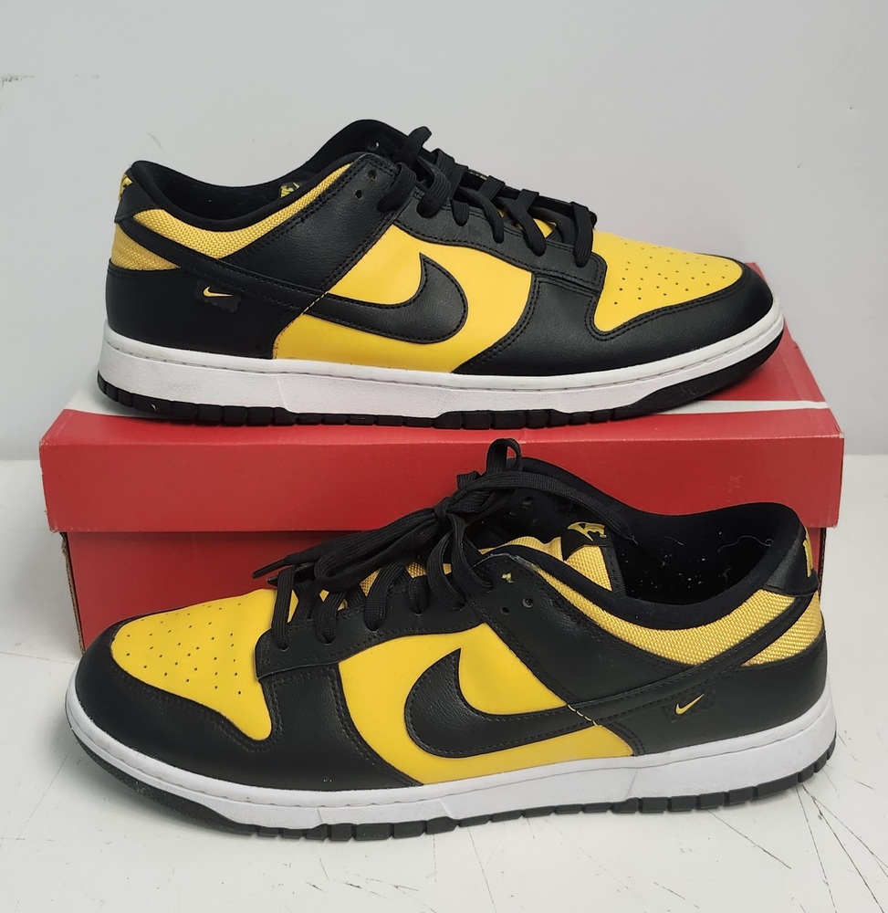 Nike Dunk Low sneakers in the Black/University Gold/White colorway, men’s size 12. Leather uppers with light wear from use. Soles and structure are solid. Includes original Nike box.