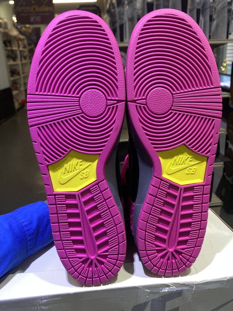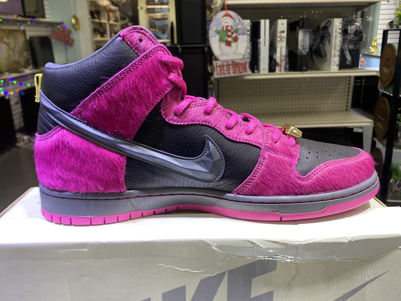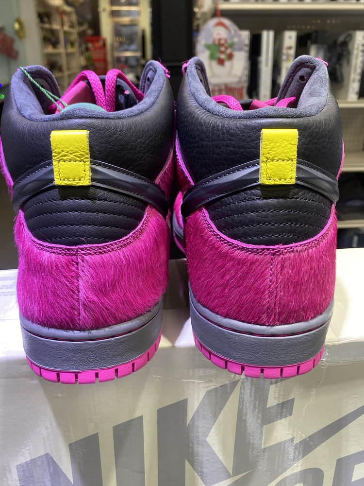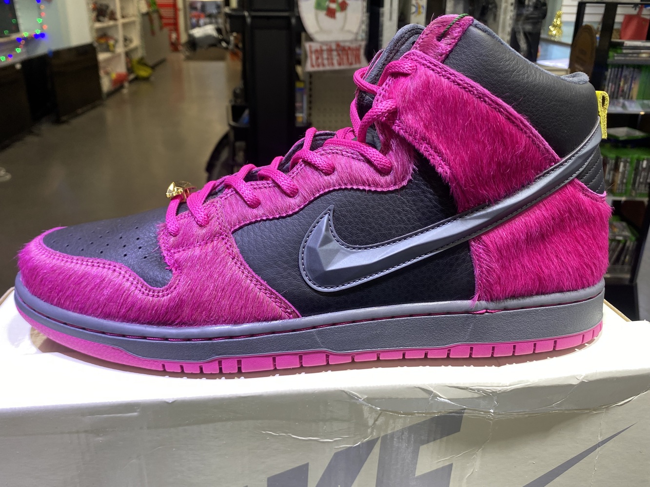 The Run The Jewels x Nike Dunk High SB ‘4/20’ pays tribute to the influential hip-hop duo formed by El-P and Killer Mike. Their dynamic sound is reflected in the shoe’s contrasting colors and textures, highlighted by a black tumbled leather upper with pony-hair overlays in a bold shade of fuchsia. The black signature Swoosh features a sculpted and polished exterior, while lace dubrae shine in metallic gold. Hidden details include a ‘Run The Jewels’ print inscribed on the inside of each collar flap and a stash pocket on the interior tongue. The high-top is mounted on a rubber cupsole that pairs black sidewalls with a fuchsia outsole.
