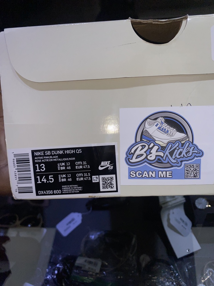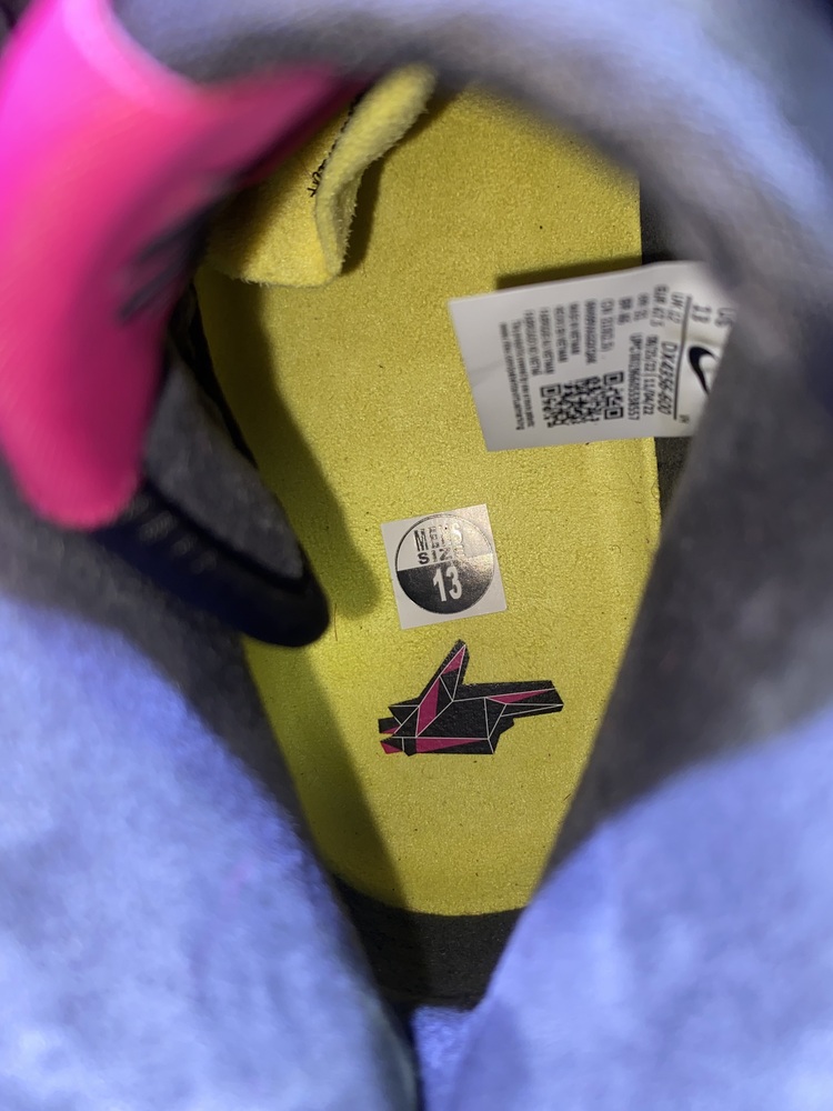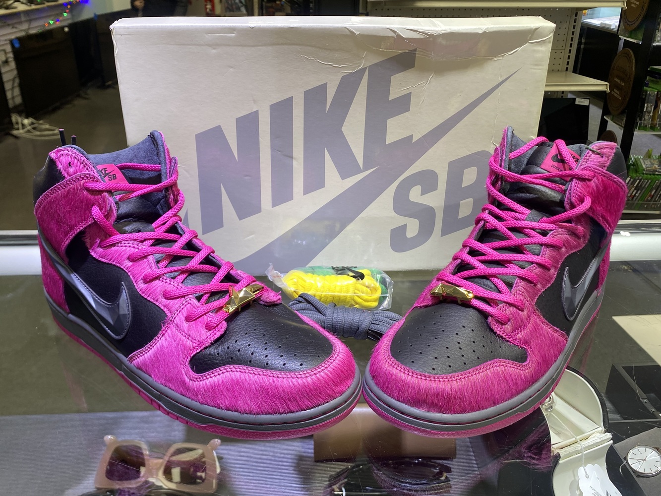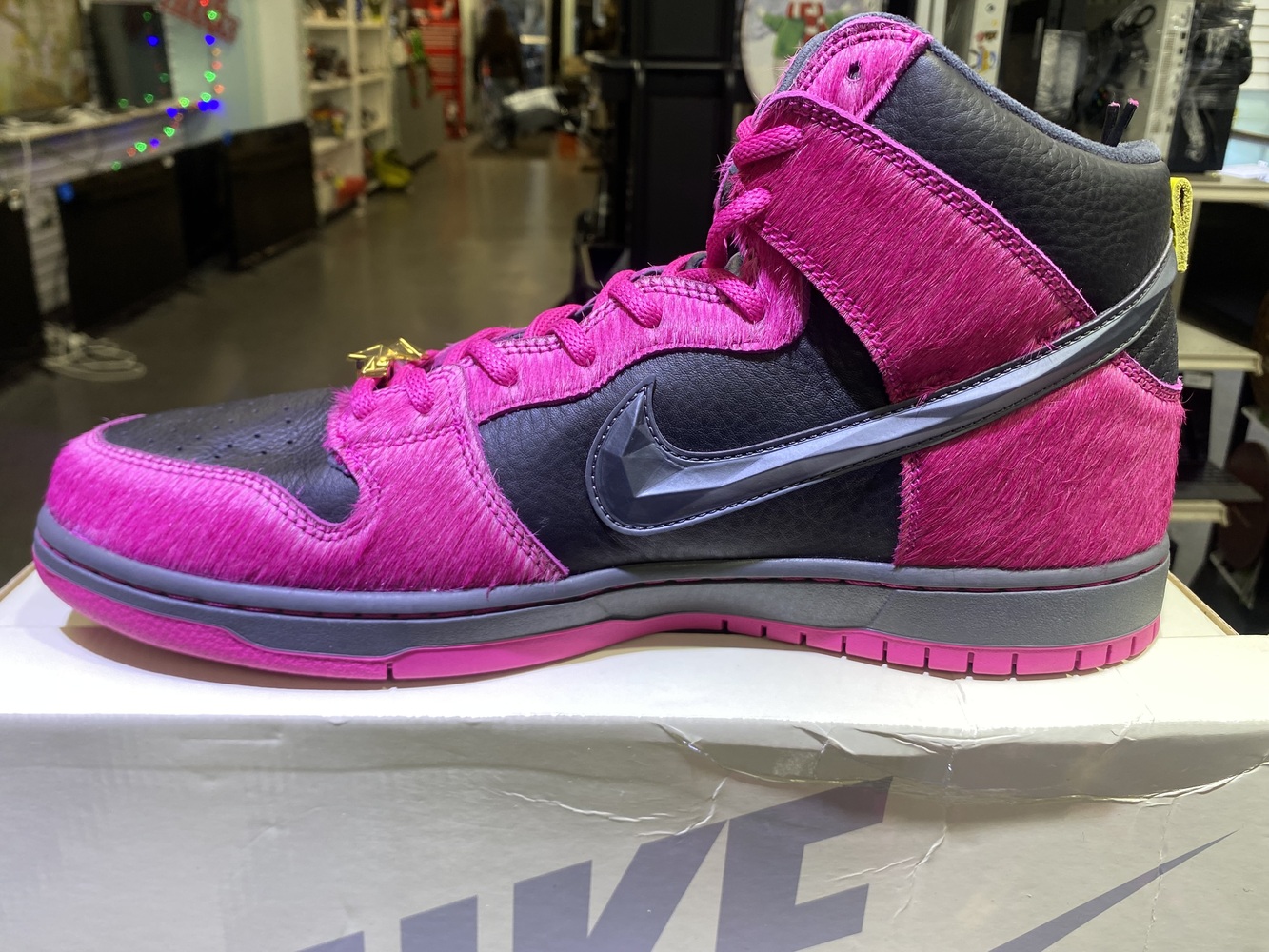The Run The Jewels x Nike Dunk High SB ‘4/20’ pays tribute to the influential hip-hop duo formed by El-P and Killer Mike. Their dynamic sound is reflected in the shoe’s contrasting colors and textures, highlighted by a black tumbled leather upper with pony-hair overlays in a bold shade of fuchsia. The black signature Swoosh features a sculpted and polished exterior, while lace dubrae shine in metallic gold. Hidden details include a ‘Run The Jewels’ print inscribed on the inside of each collar flap and a stash pocket on the interior tongue. The high-top is mounted on a rubber cupsole that pairs black sidewalls with a fuchsia outsole.