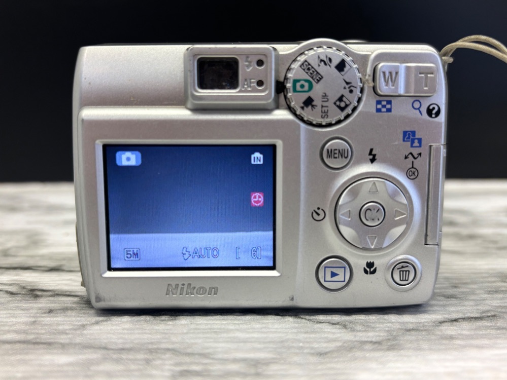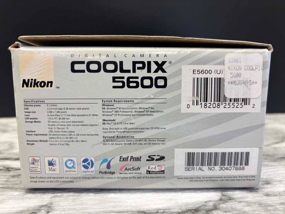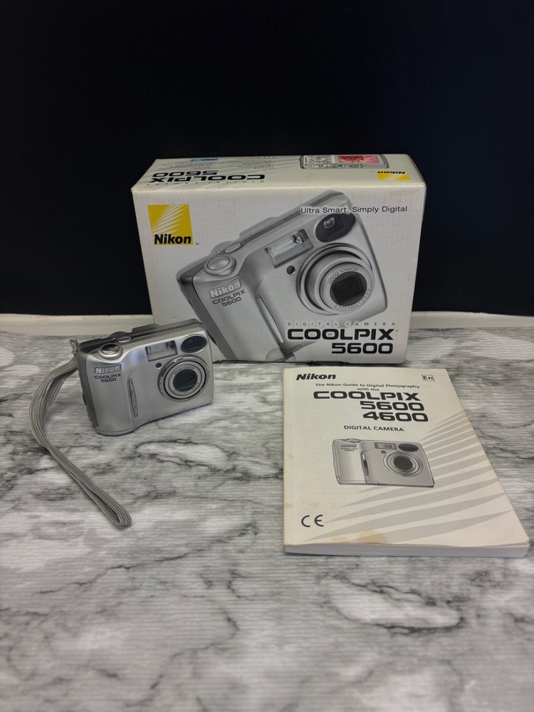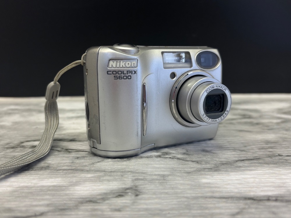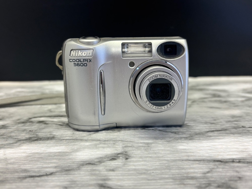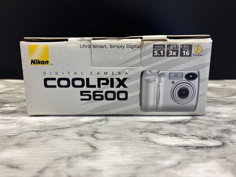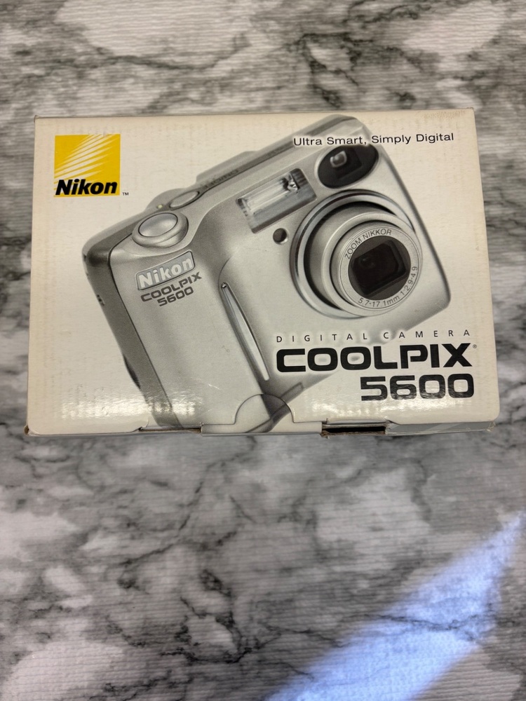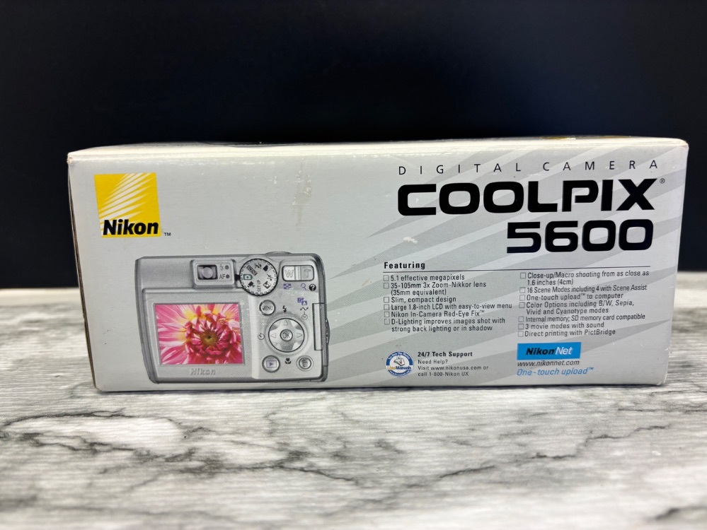 See how simple digital photography can be with this ultra-smart Nikon Coolpix 5MP Digital Camera. The 5600 has a 5-megapixel resolution with a 4x optical zoom plus 3x digital zoom for total zoom of 12x. Camera's large 1.8" amorphous silicon TFT color LCD with brightness adjustment offers easy viewing and playback. Other features include real-image optical zoom viewfinder; Contrast AF autofocus; TV movie mode with sound; approximately 14.5 MB internal memory (SD memory card compatible); built-in speedlight with auto and red-eye reduction modes; 10-second self-timer and continuous shooting: 1.3 frame shots per second. Made in USA. 2-2/5Hx1-2/5Wx3-1/3L".