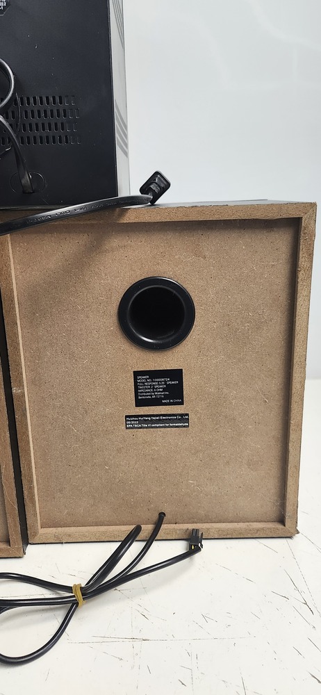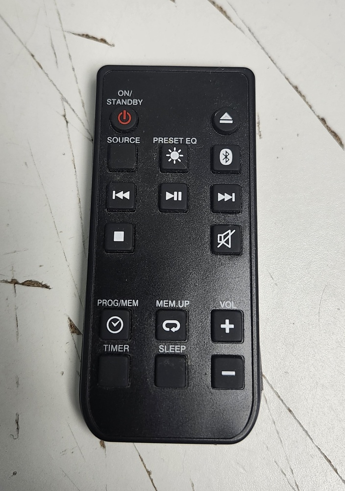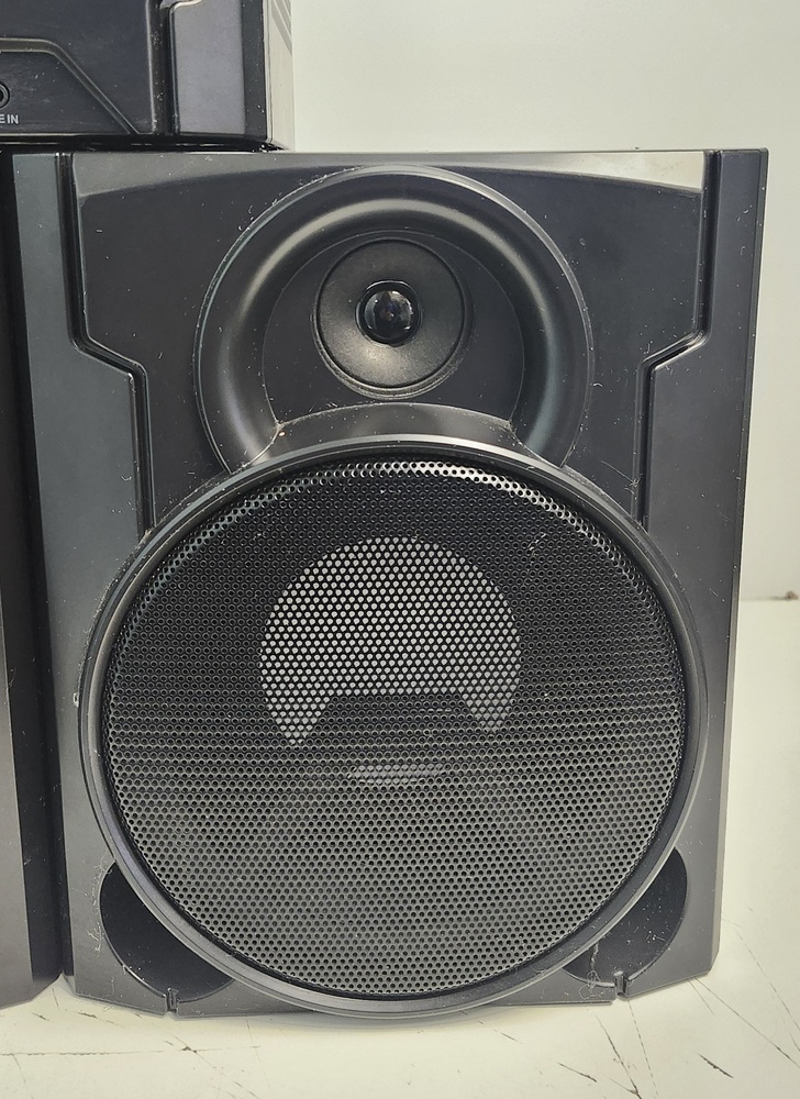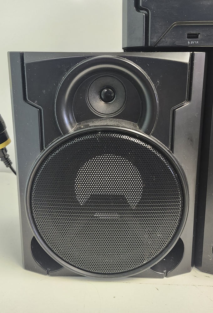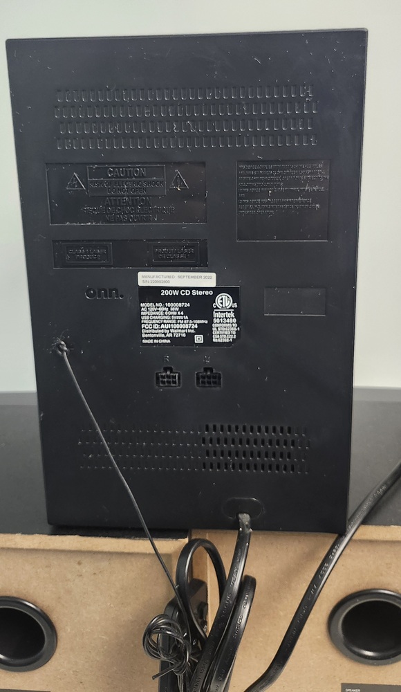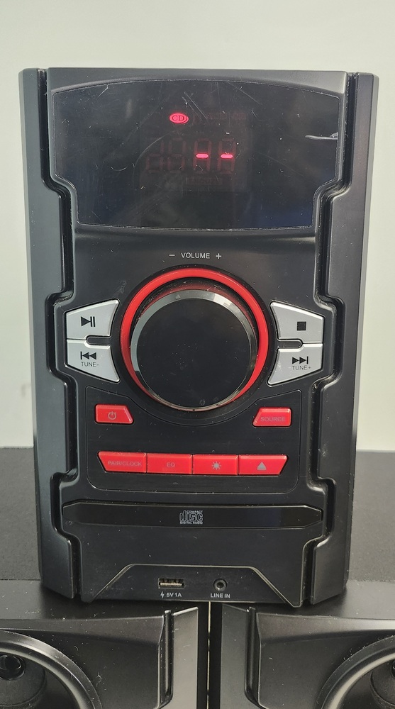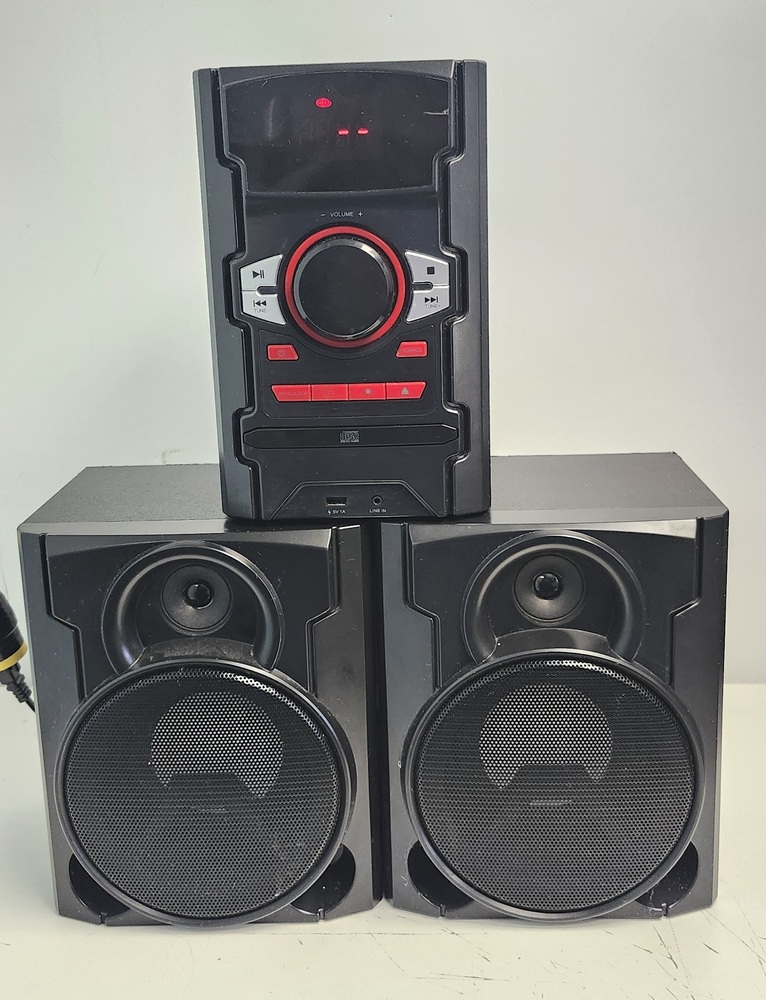 Onn 200W CD stereo system with Bluetooth, FM radio, USB playback, and line-in. Plays CDs and streams audio from any Bluetooth device. Comes with the original matching speakers and remote control. Everything functions properly.