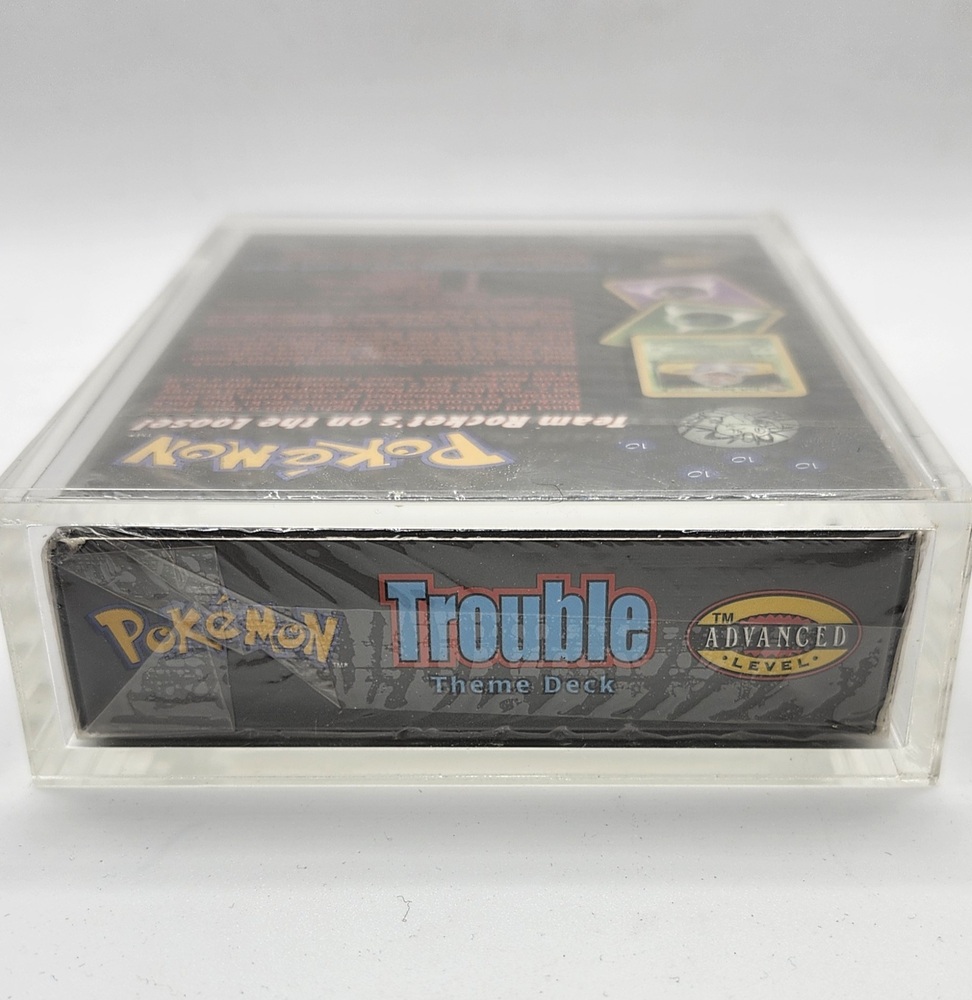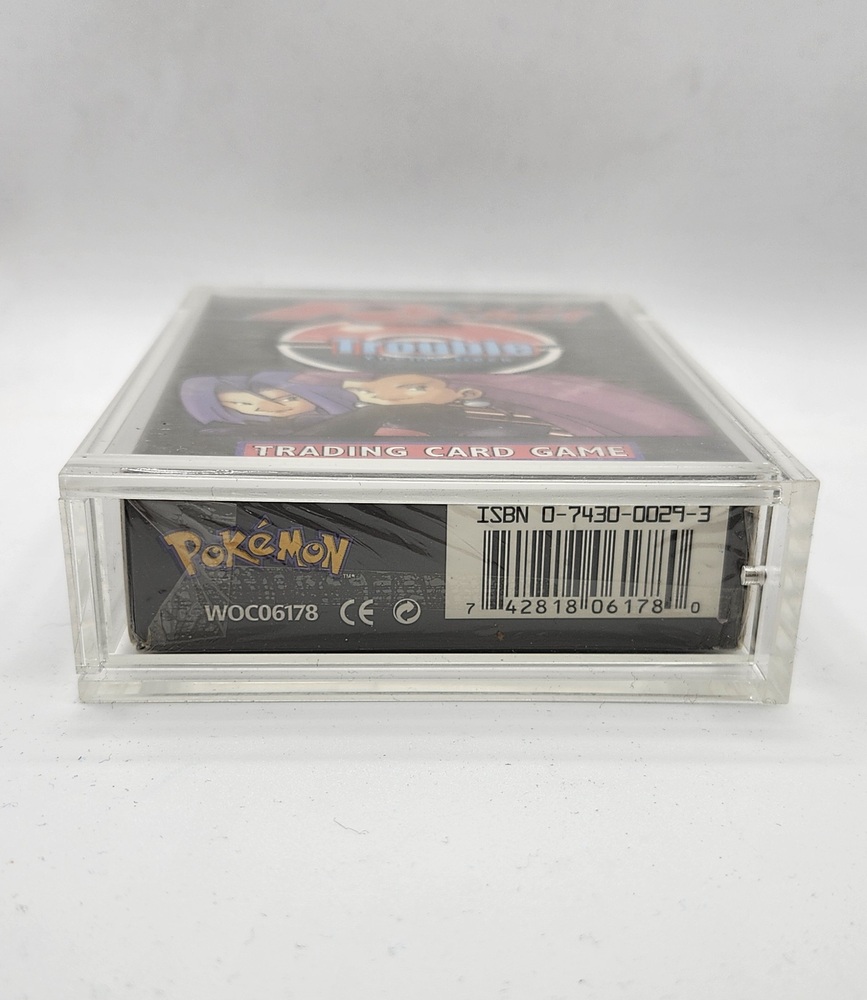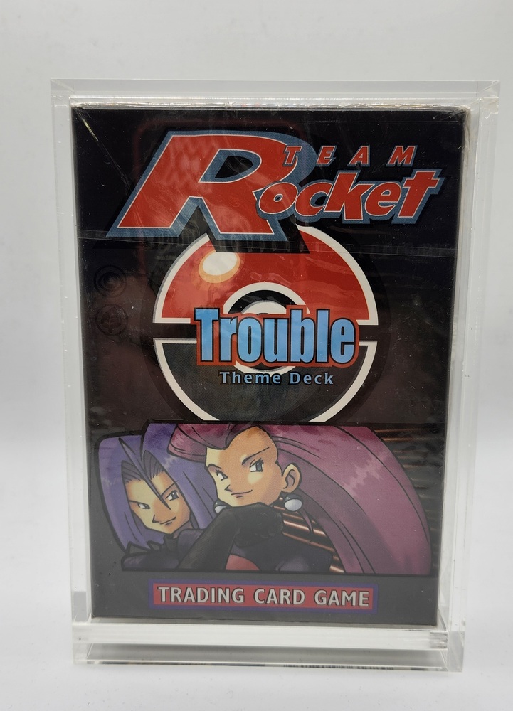 This is an authentic sealed Pokémon Trading Card Game Theme Deck from the classic Team Rocket era. The deck is the Trouble preconstructed 60-card set by Wizards of the Coast (2000). It includes the original sealed contents: 60 game cards, a Pokémon coin, damage counters, rulebook, and card list. A special holographic card is included randomly inside the original packaging.
