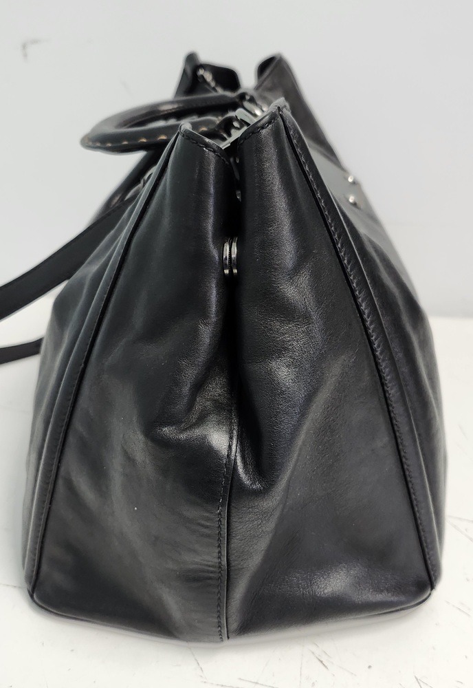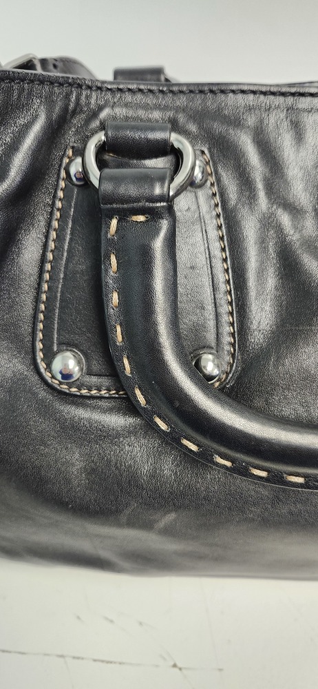 Authentic Prada Vitello leather satchel tote in classic black with a beige suede interior. This timeless Prada piece features: