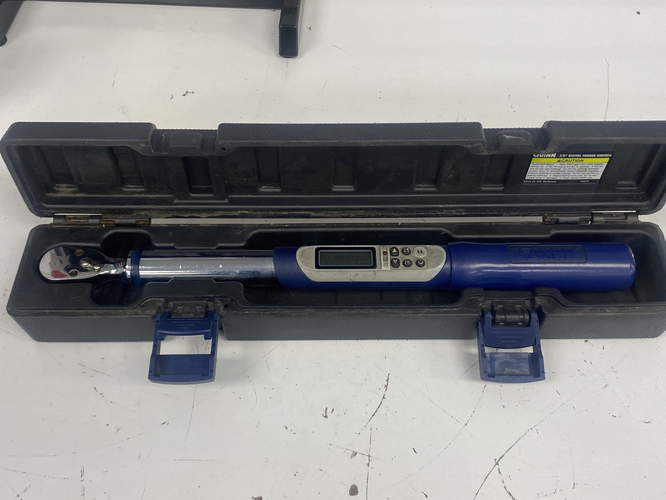 The QUINN 3/8 in. digital torque wrench has a 72-tooth ratchet mechanism with a 5° arc swing that makes it easy to work in tight spaces. This 5 to 100 ft-lb digital torque wrench offers speed, accuracy, and an easy-to-read LCD display. LED lights and an audible beep indicate when the desired torque value or angle is reached. Guaranteed accurate within +/- 3% clockwise, this torque wrench can store up to 9 preset torque ratings. Switch easily between torque and angle modes for use with torque-to-yield fasteners.