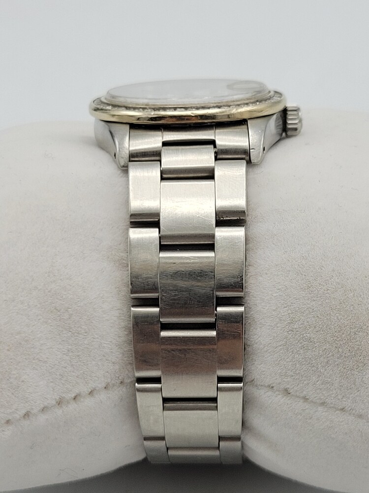 Good pre-owned condition with normal surface wear from regular use on the bracelet and case. Crystal has surface scratches that can be buffed, dial is clean, and the watch runs smoothly. Aftermarket diamond bezel is secure and bright. No box or papers included.