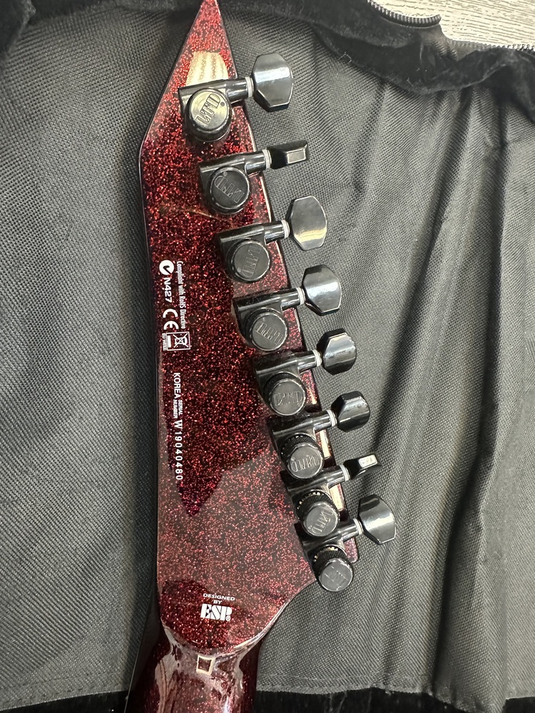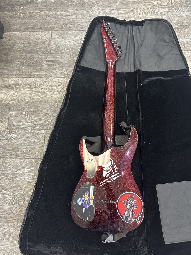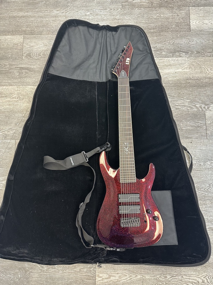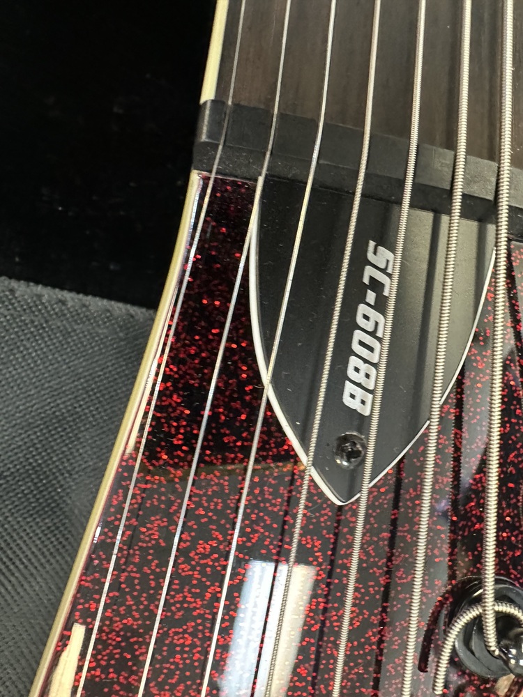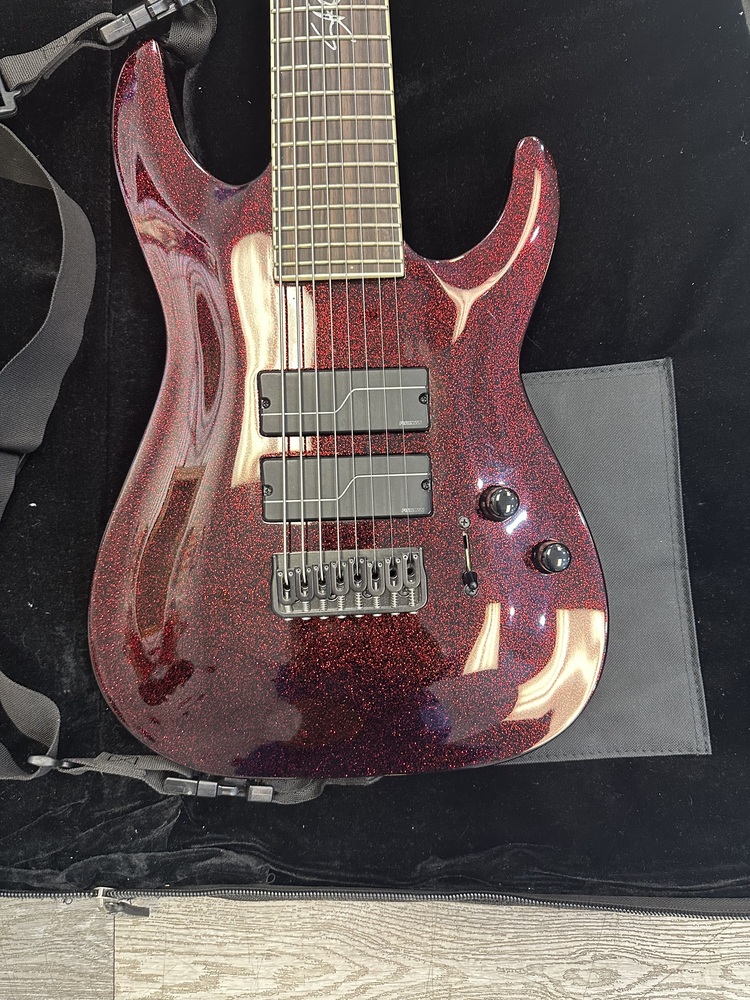 Based on a custom guitar that Stephen Carpenter calls "Dorothy" due to its red sparkle finish (if you're confused, look up the classic 1939 movie "The Wizard of Oz" and the ruby slippers of the main character), the SC-608 Baritone is an 8-string, neck-thru-body guitar at 27" baritone scale. For players of all styles and genres who love the depth of an extended range of tones, the SC-608 Baritone is just a monster, with a mahogany body, maple neck, and 24-fret Macassar ebony fingerboard. Its Fishman Fluence SRC Signature active pickup set has multiple voicings; use the push-pull control on the volume knob to select the one you want. On the middle alnico pickup, push down for “Modern Active” tone or pull up for “Modern Passive Attack”. On the bridge ceramic pickup, push down for “Modern Passive Attack” tone or pull up for “Modern Active” voicing. Watch Stef talk about the SC-608 Baritone