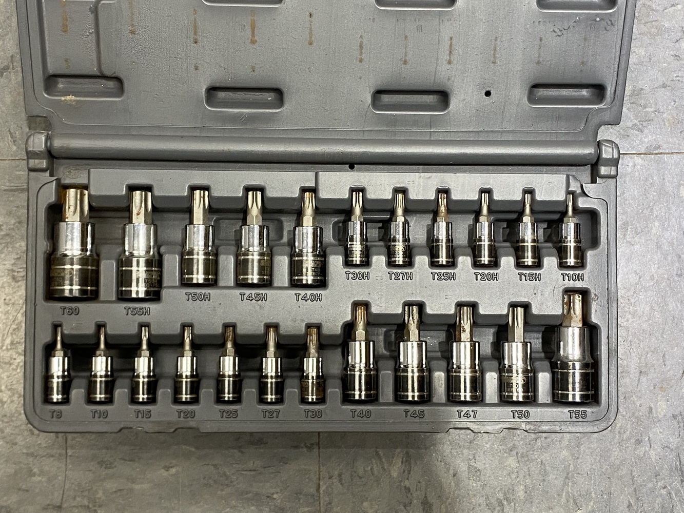 This socket set is preowned. There are some signs of wear and rust on some of the tips. SEE PICTURES.
