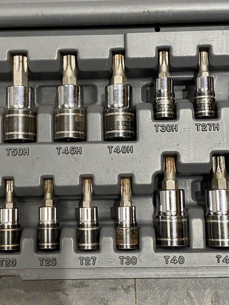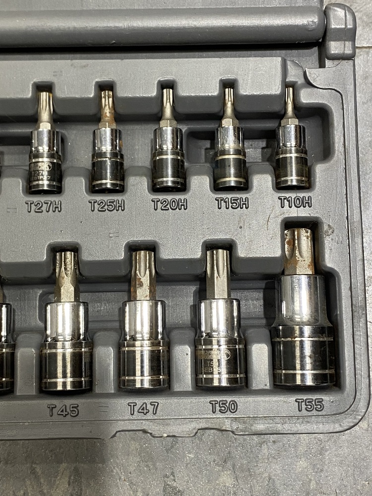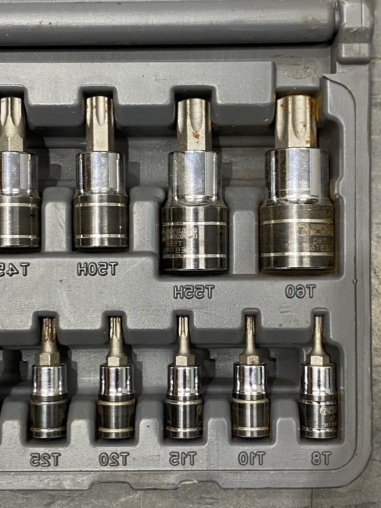 - Comprehensive TORX bit socket set includes 1/4", 3/8" and 1/2" drive sizes without duplicate sizes.