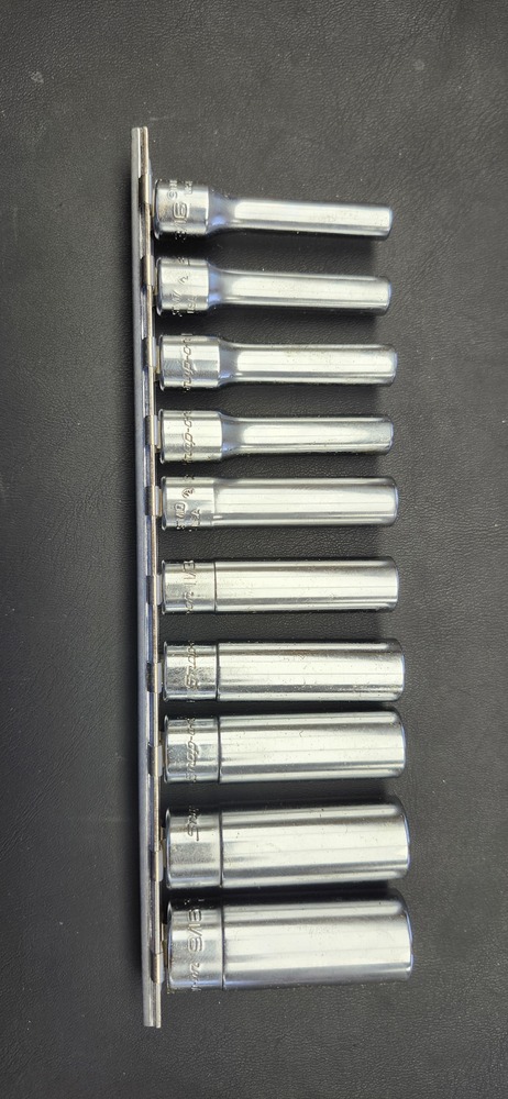 Snap-on 113TMMY 1/4" drive metric 6-point socket set. Includes 13 sockets (4–15 mm) on the original Snap-on rail with the matching box. Sockets unused and were only stored. Great condition overall.