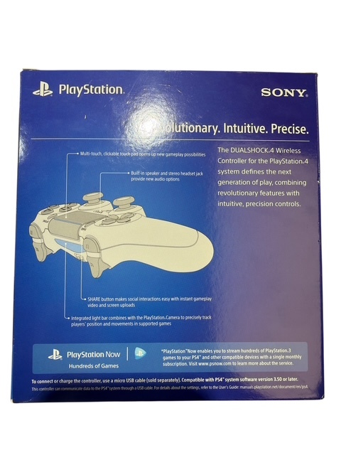 | Brand new, sealed Sony PS4 Controller. Features enhanced analog sticks and trigger buttons for improved accuracy. Equipped with built-in speaker, touchpad, and light bar. In-built rechargeable battery. Compatible with PS4 console. Offers immersive gaming experience. Box includes controller, instruction manual, and USB cable. Original Sony product. |