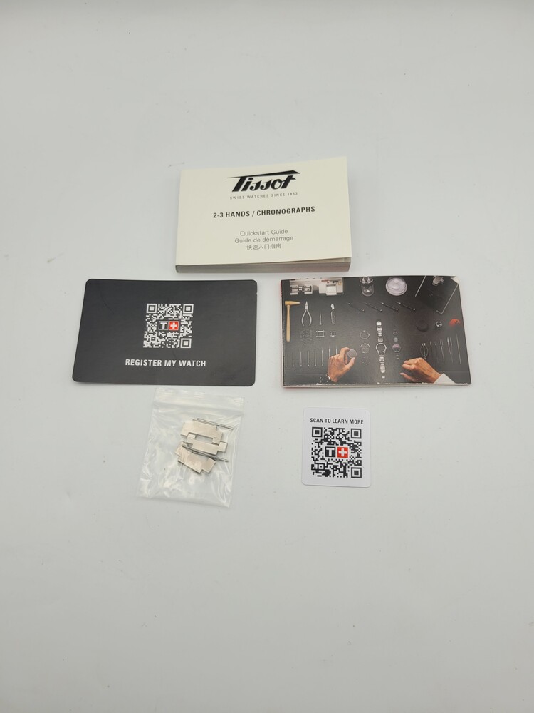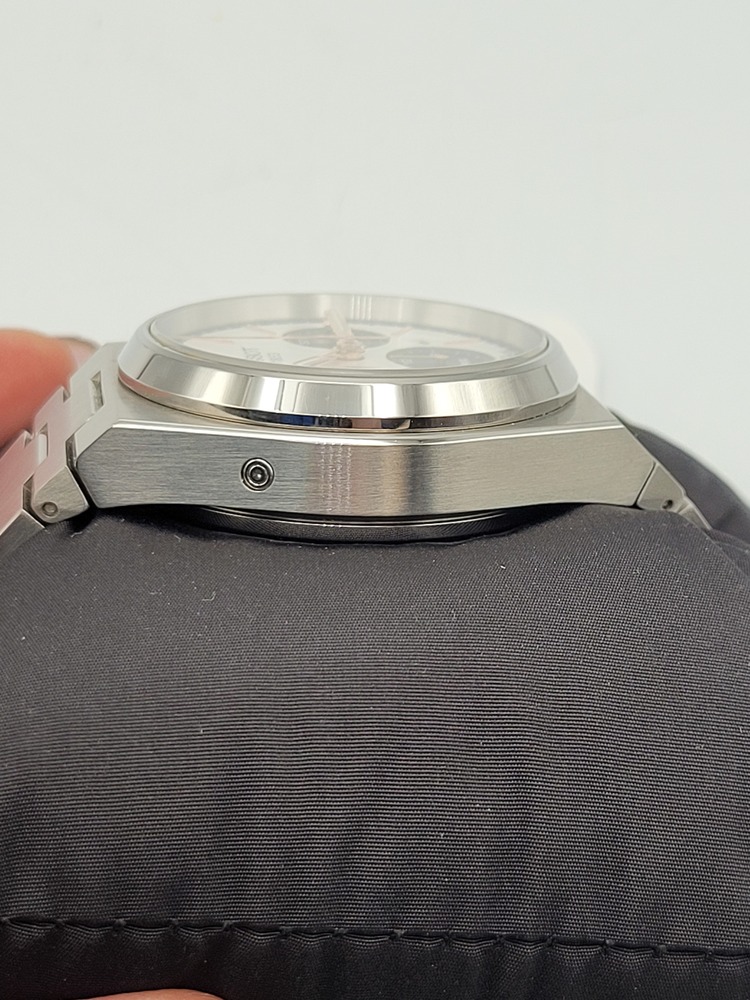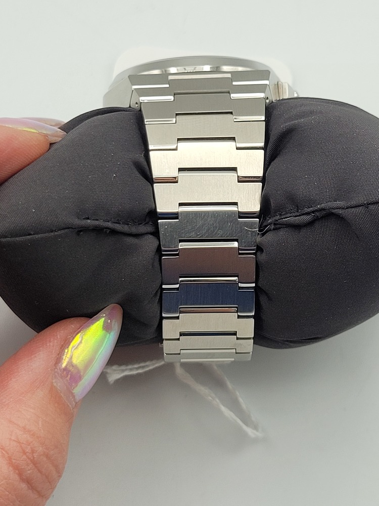 The 40mm case offers a bold yet wearable profile, paired with a fixed bezel and crisp chronograph subdials for both function and style. The dial features a date window at 4 o’clock and luminous markers for enhanced readability. This PRX includes its original box, booklet, QR cards, and extra links.