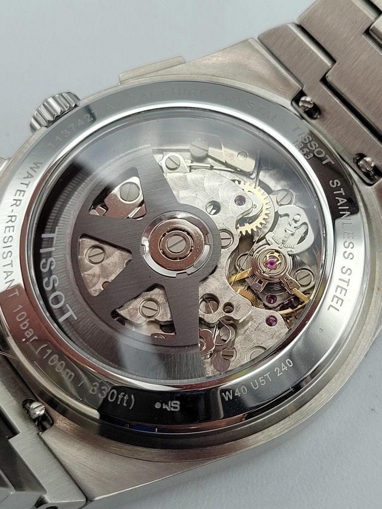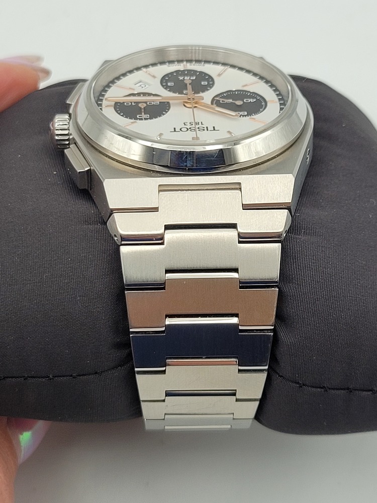 This listing features a pre-owned Tissot PRX Automatic Chronograph in stainless steel, showcasing the iconic panda dial with rose-gold accents. This model blends vintage-inspired charm with modern precision, powered by a Swiss automatic movement visible through its sapphire exhibition caseback. The integrated stainless-steel bracelet, brushed and polished throughout, delivers a sleek and elevated wrist presence.