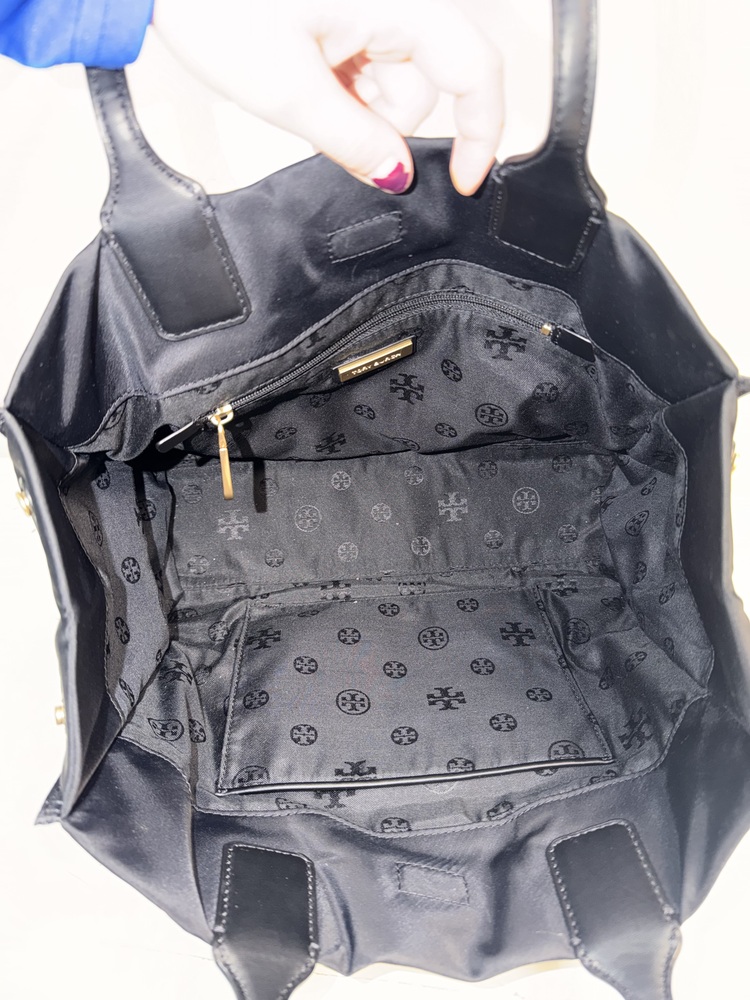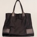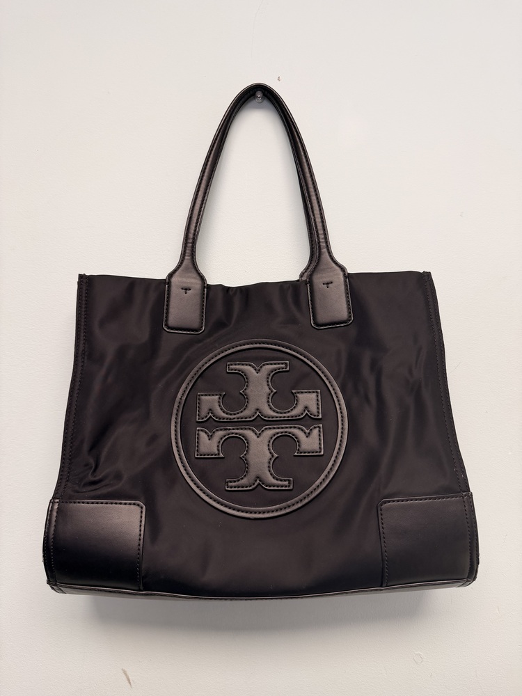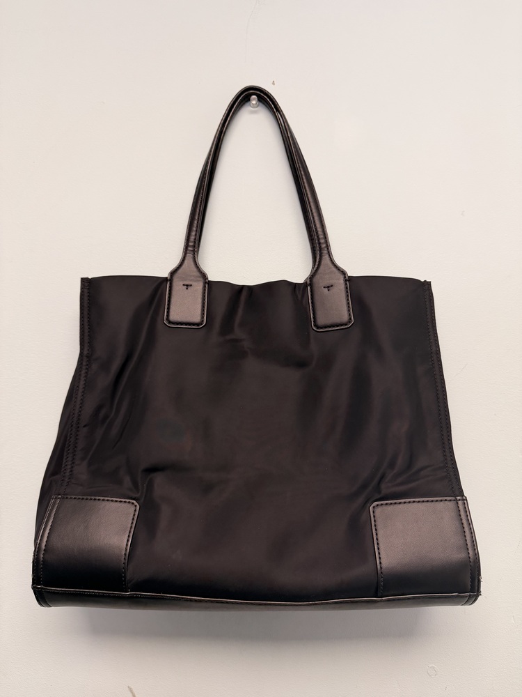 The iconic Ella nylon tote bag in miniature size is highlighted with faux patent leather trim and the signature logo.
