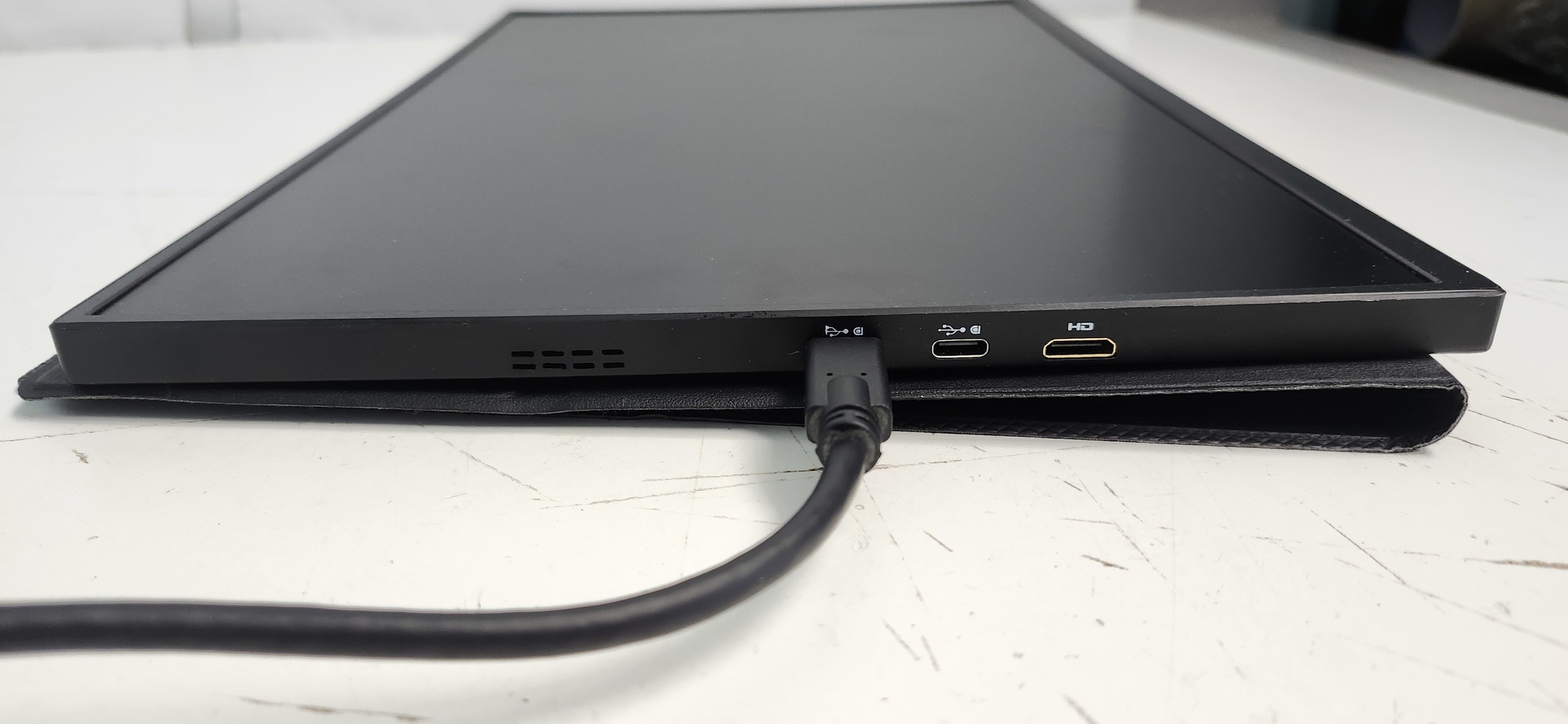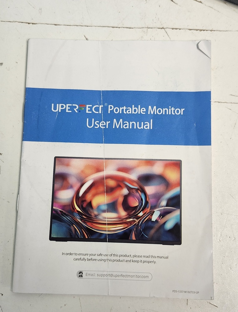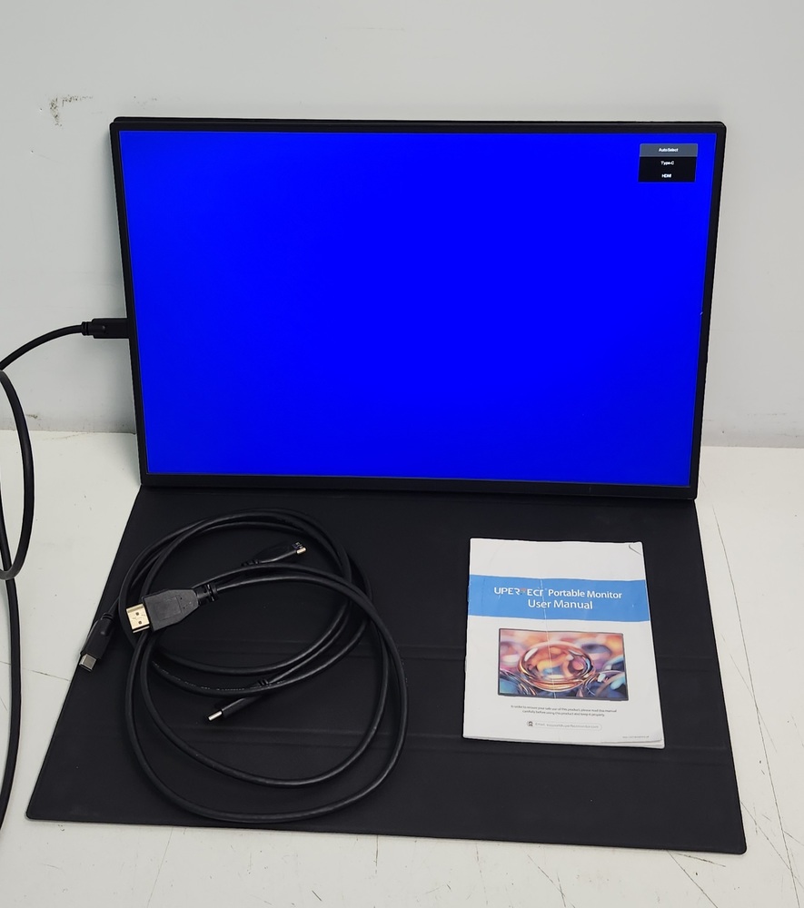 UPERFECT 15.6" portable monitor with USB-C and Mini HDMI connections. Works great as an external screen for laptop, console, or phone. Includes monitor, cover/stand, USB-C cable, HDMI cable, and user manual.