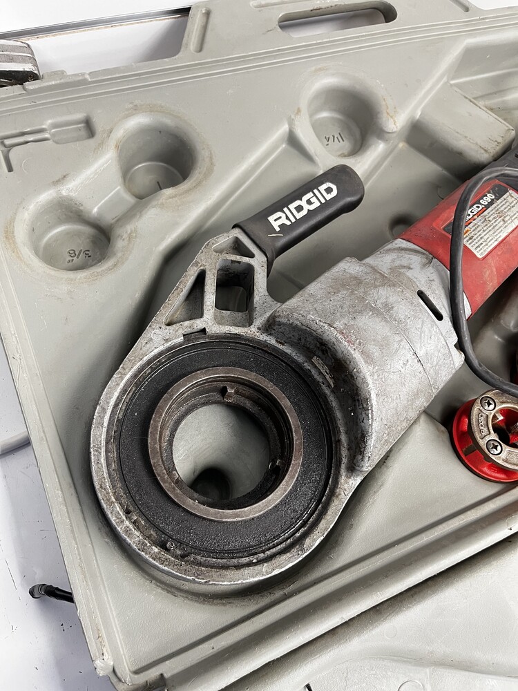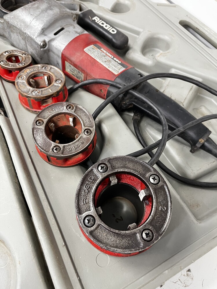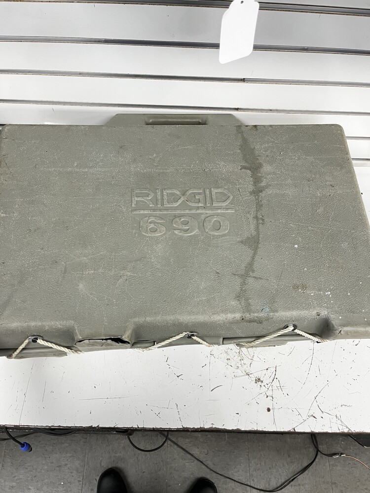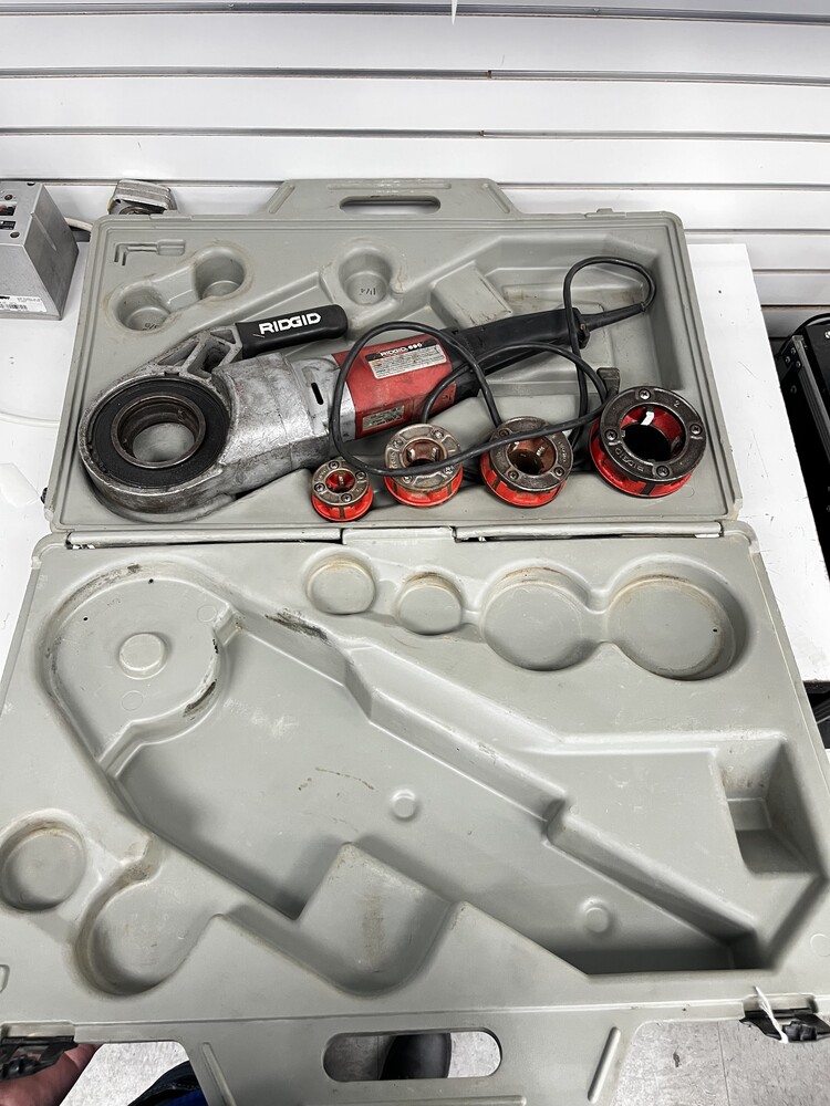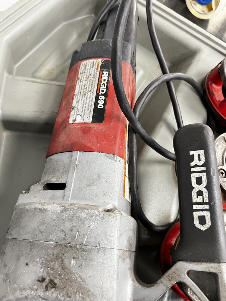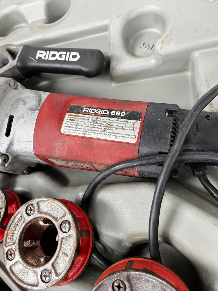 RIDGID 690 electric pipe threader, complete with its original hard case and multiple dies. This unit shows signs of use such as scuffing or cracking on case but is fully functional and ready for the jobsite. Includes several die heads (as shown) and the RIDGID handle. The case securely and keeps everything organized for easy transport. ***MISSING 1 1/4, 1, and 3/8 DIE THREAD SHOWN IN PICTURES ***