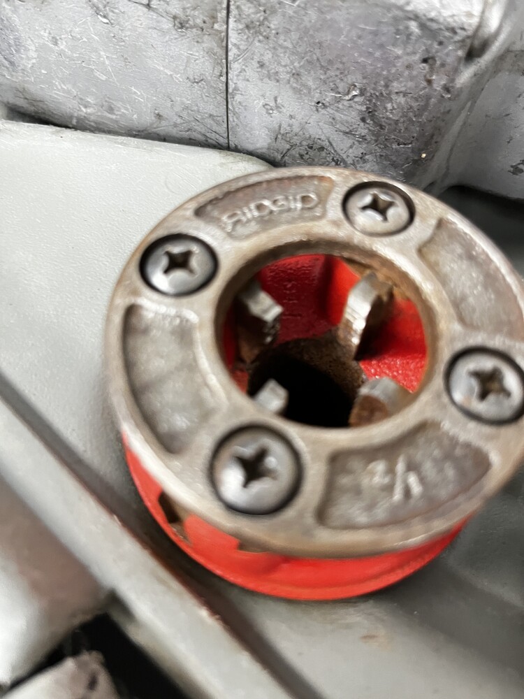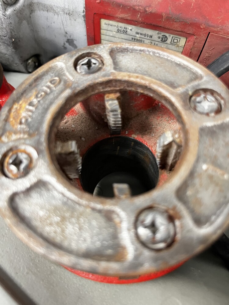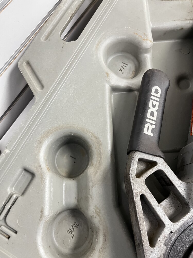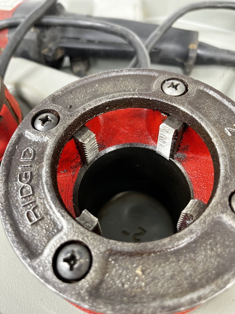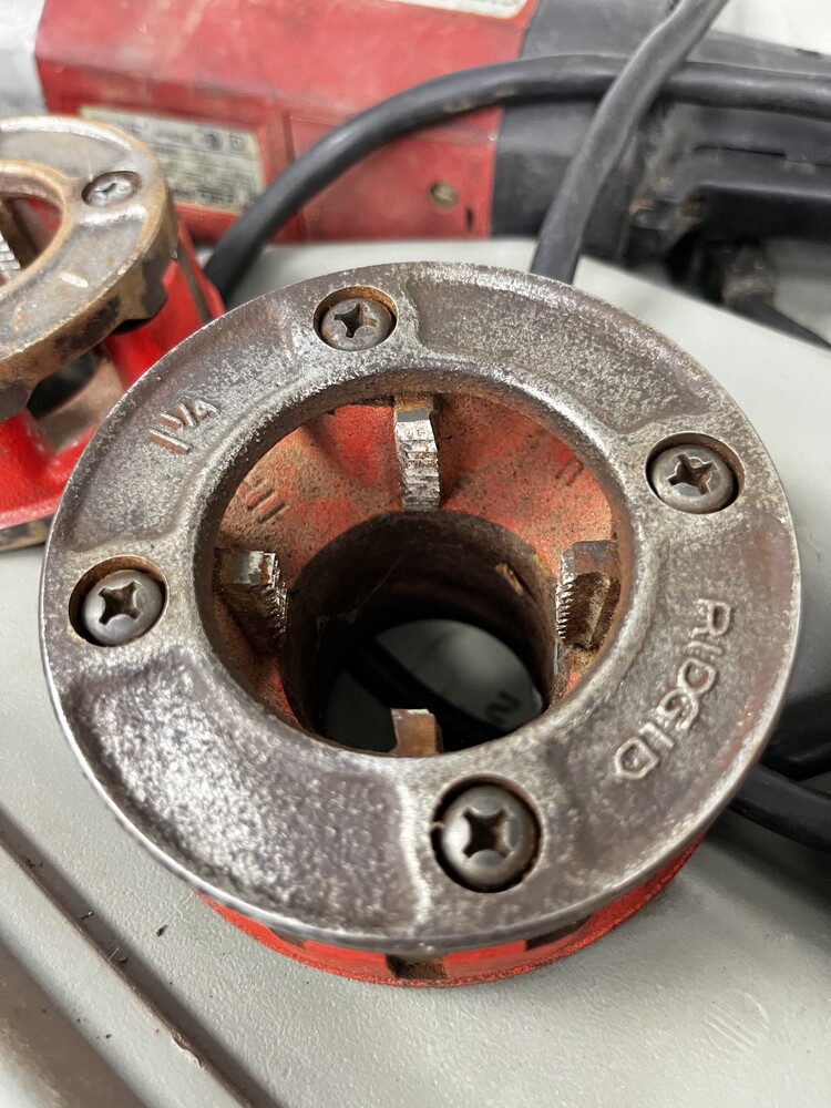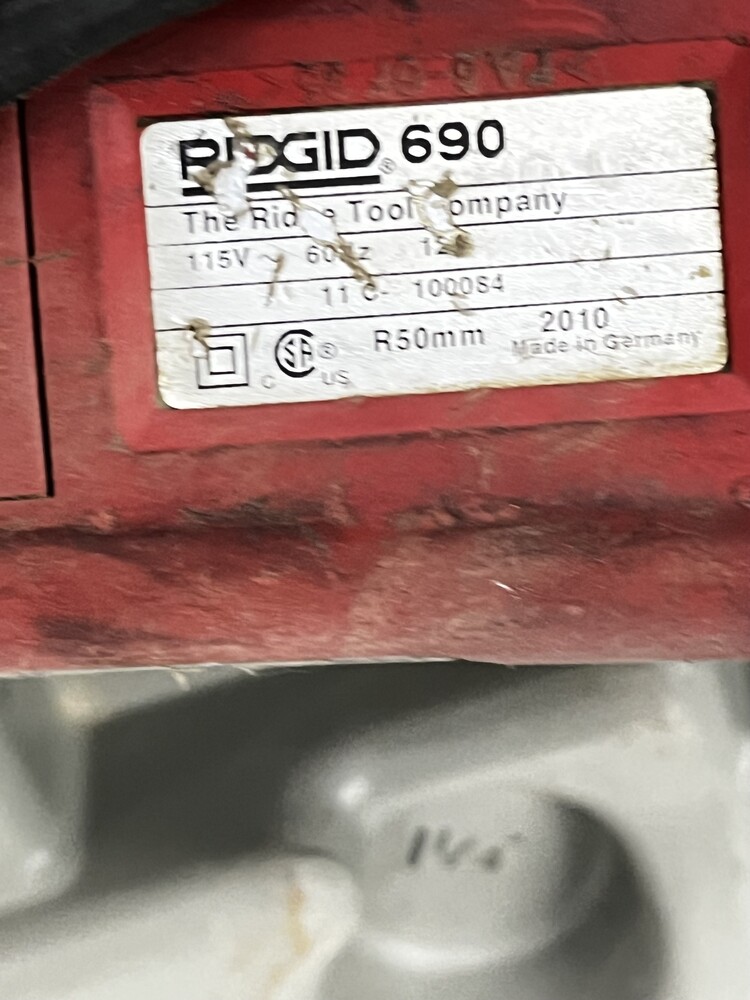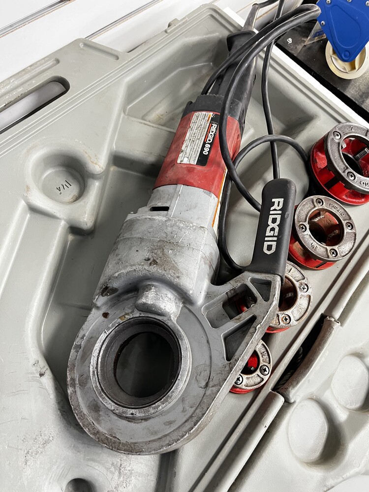 RIDGID 690 electric pipe threader, complete with its original hard case and multiple dies. This unit shows signs of use such as scuffing or cracking on case but is fully functional and ready for the jobsite. Includes several die heads (as shown) and the RIDGID handle. The case securely and keeps everything organized for easy transport. ***MISSING 1 1/4, 1, and 3/8 DIE THREAD SHOWN IN PICTURES ***