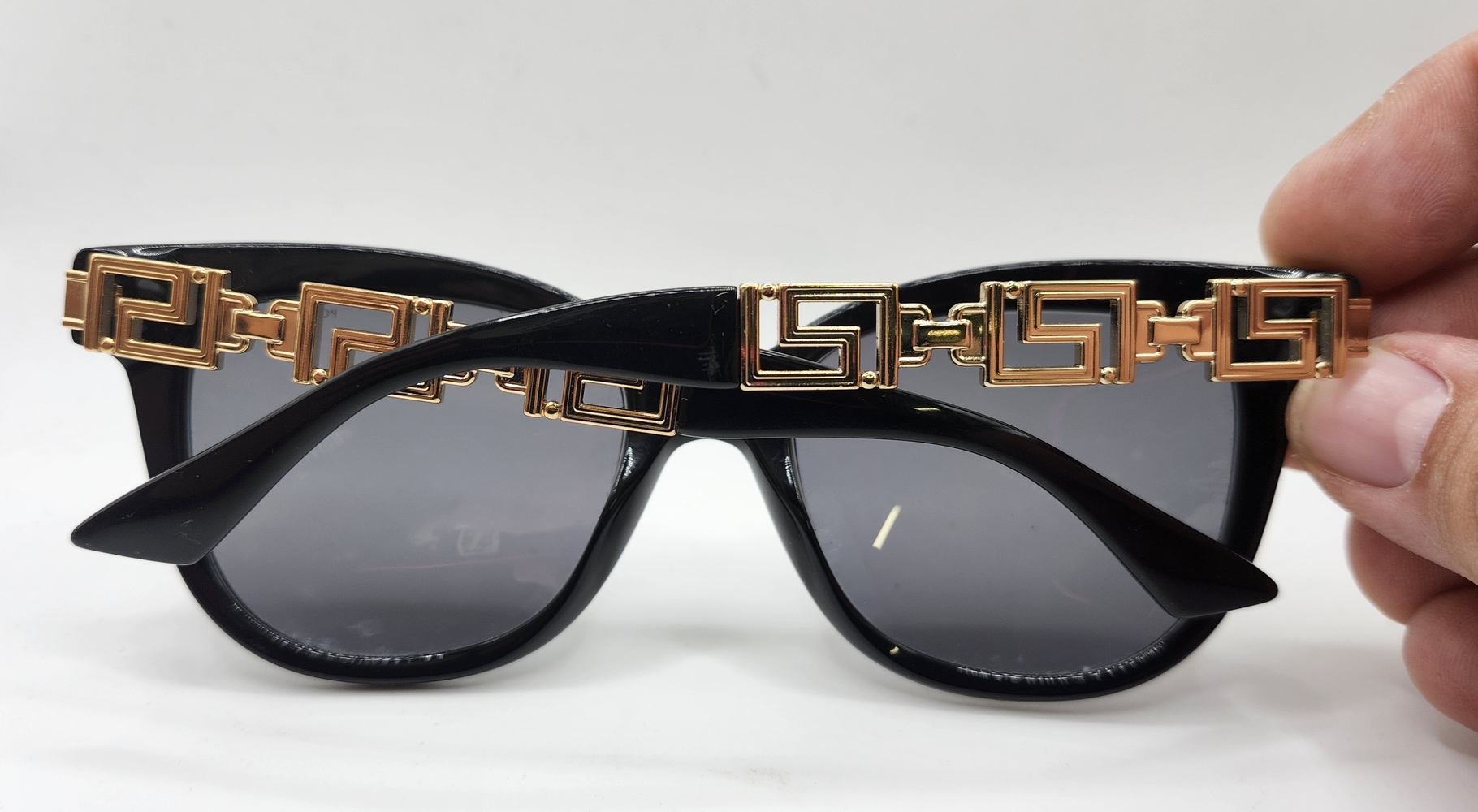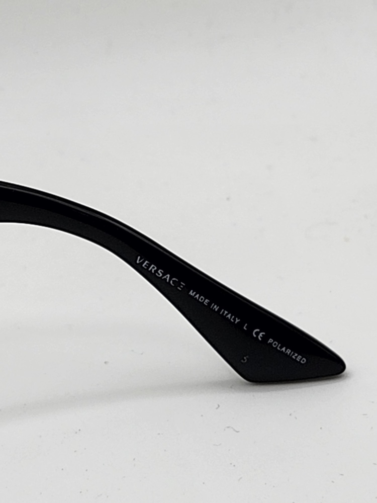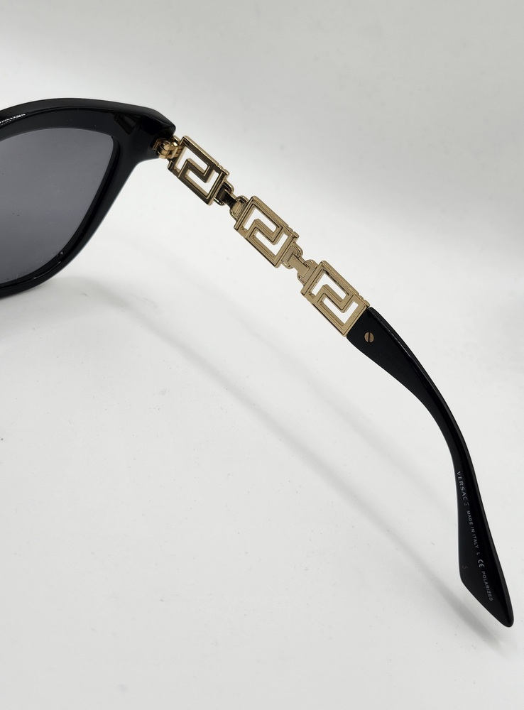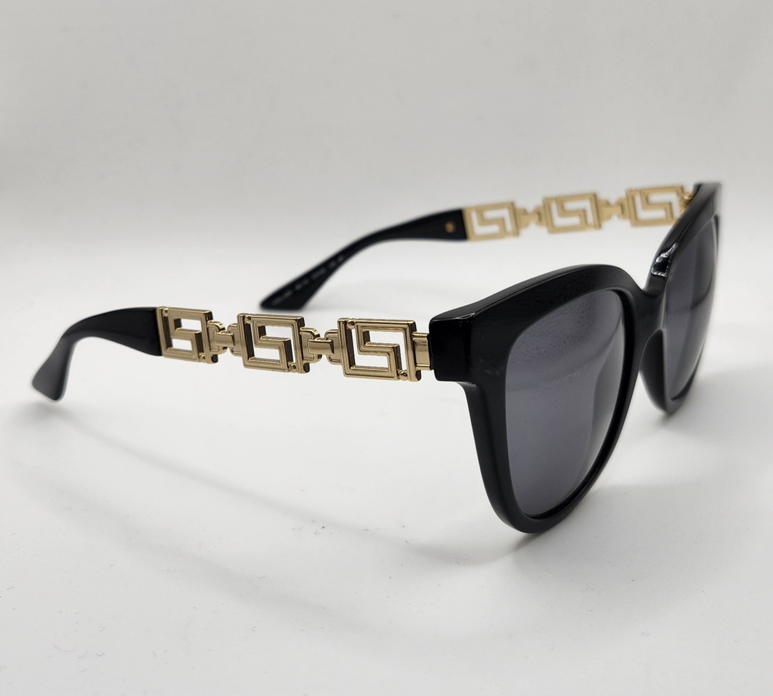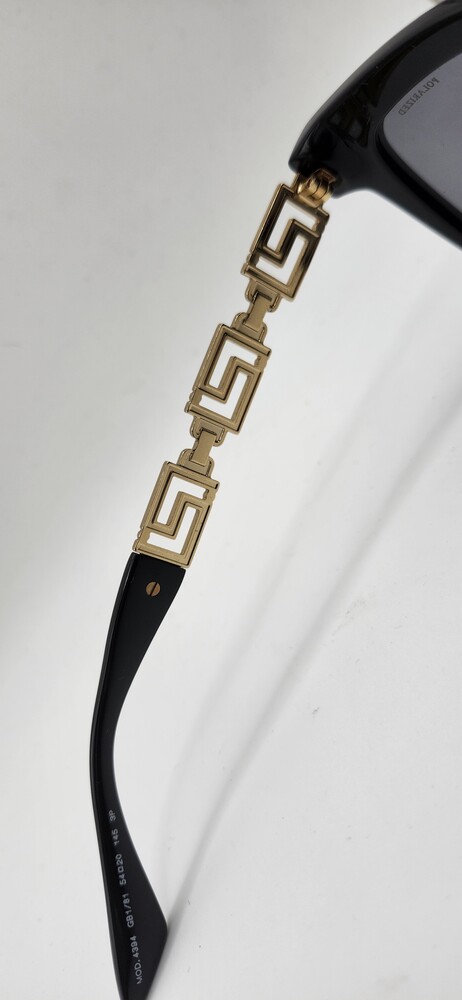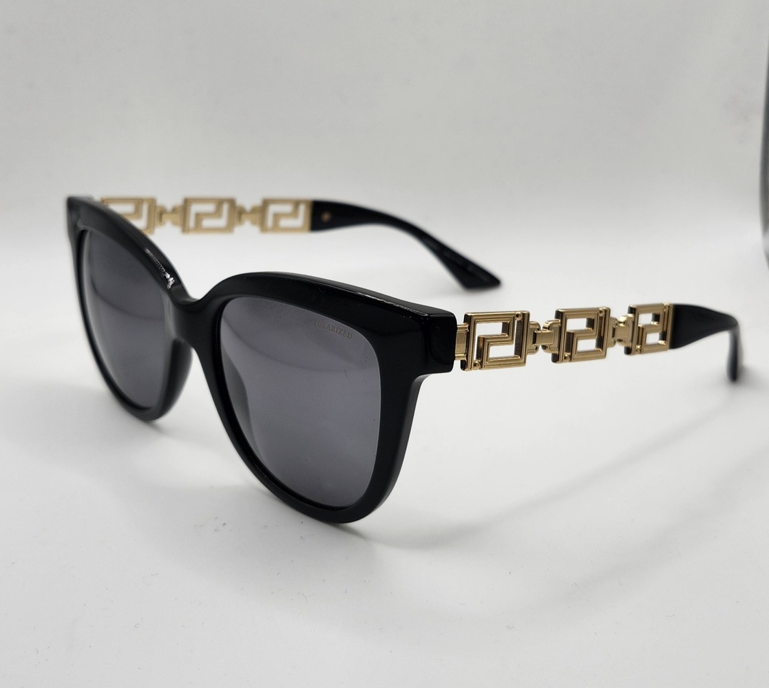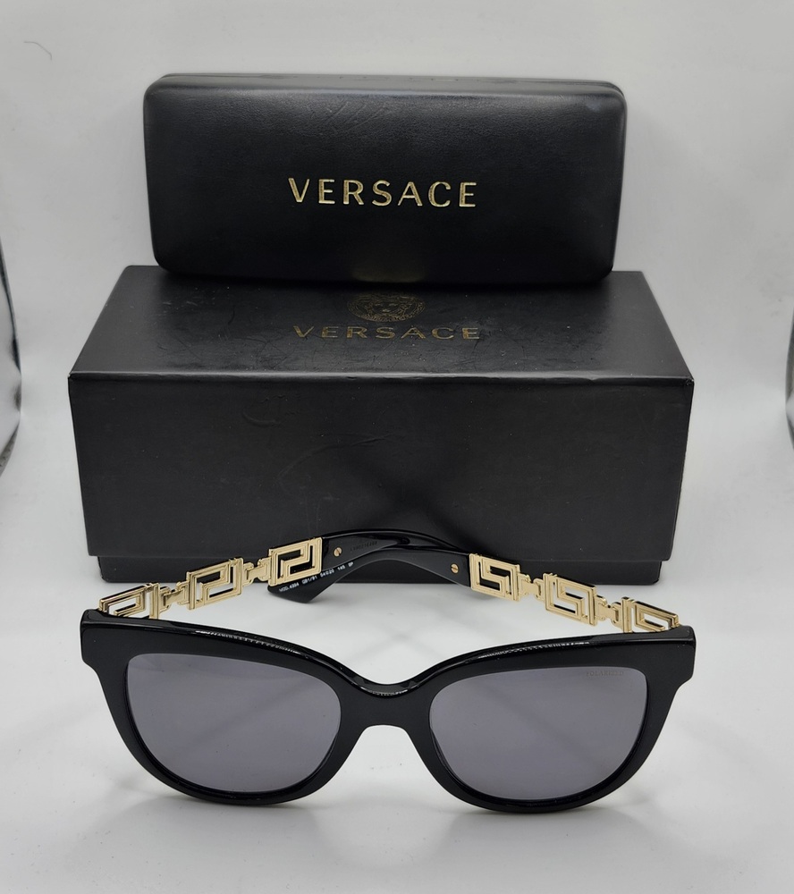 Authentic Versace VE4394 sunglasses in black with gray polarized lenses. Features the signature gold Greca chain temples. Size 54-20-145. Made in Italy. Comes with Versace case and outer box. Clean and ready to wear.