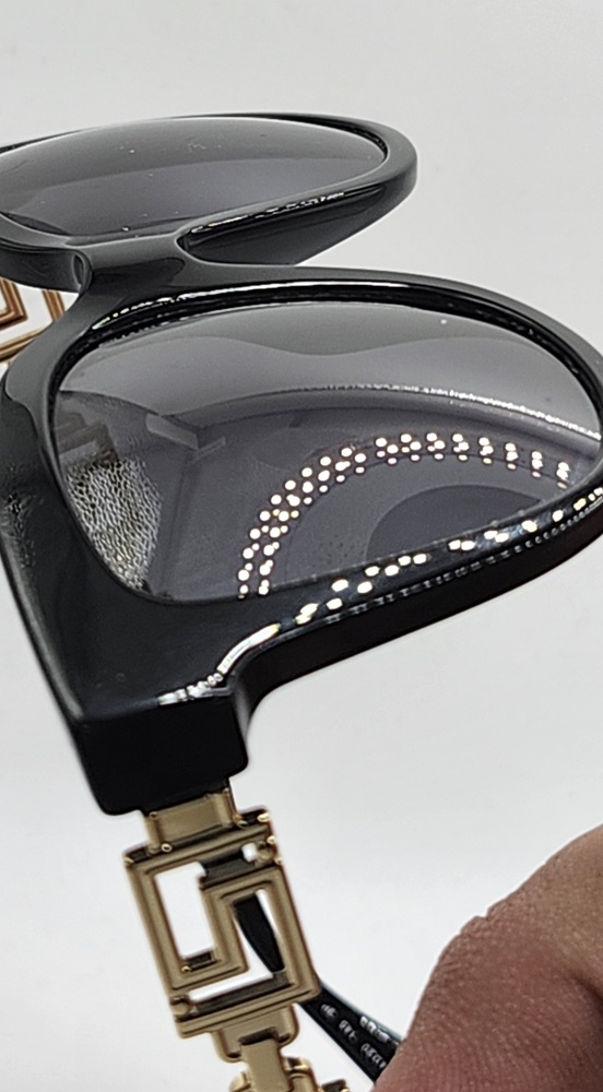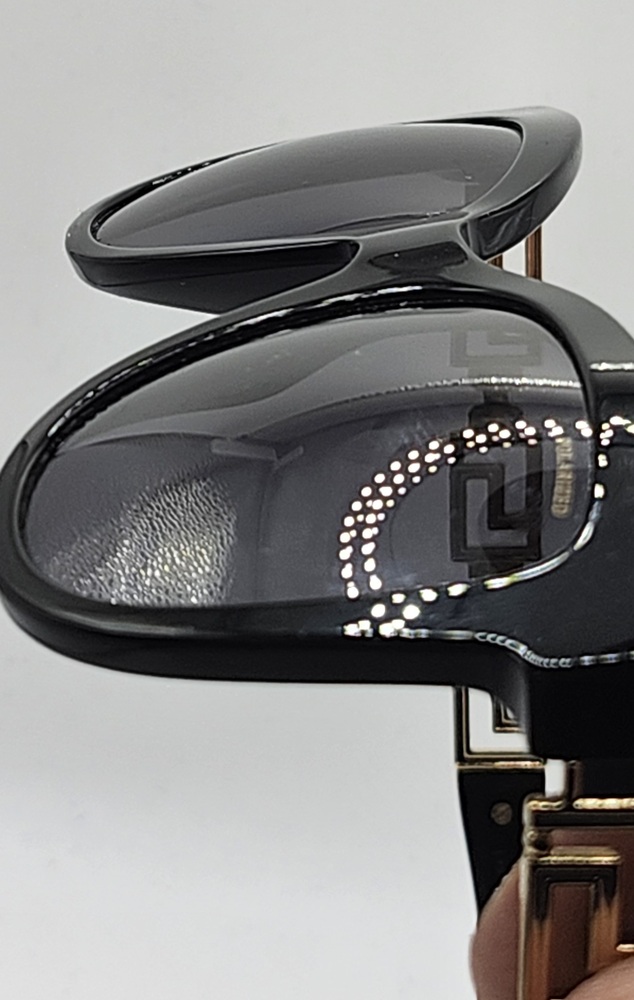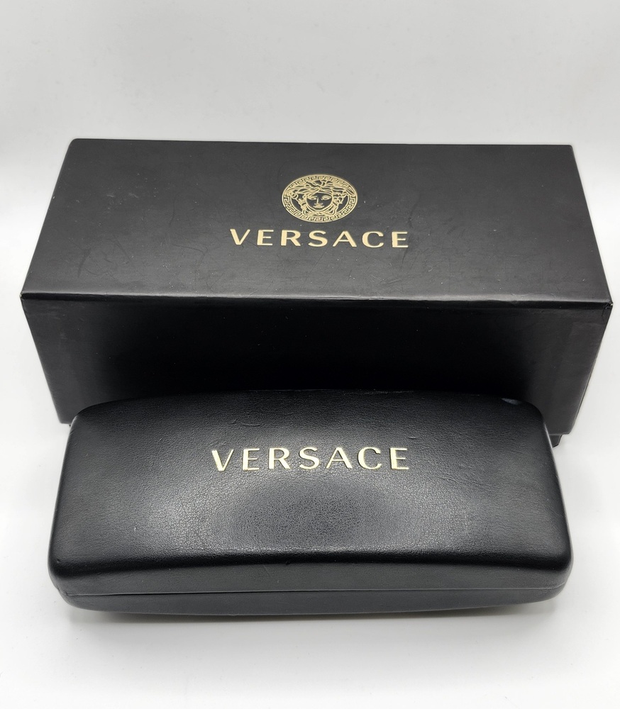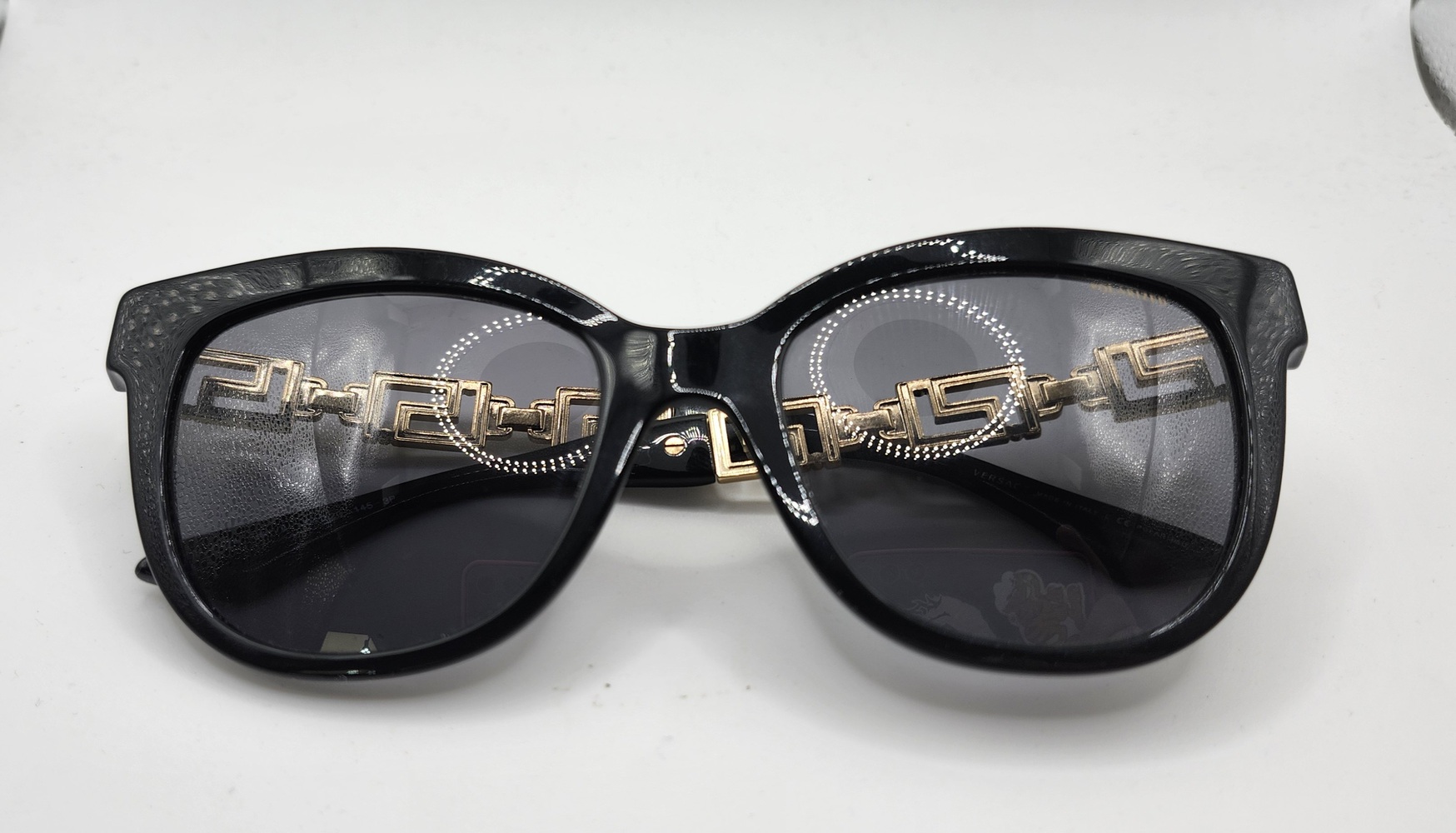 Pre-owned. Overall great condition—no major scratches on lenses or frame. Gold Greca temples look excellent. Case and box included.