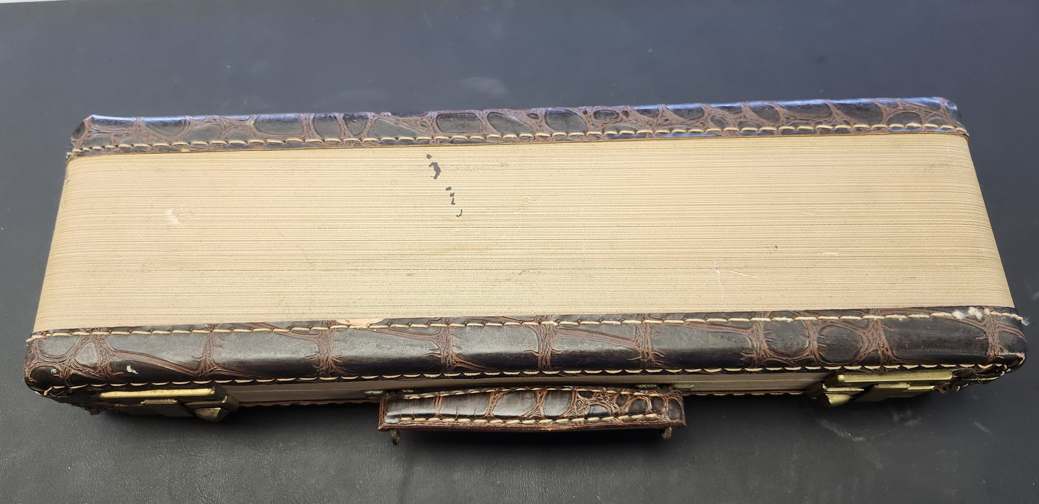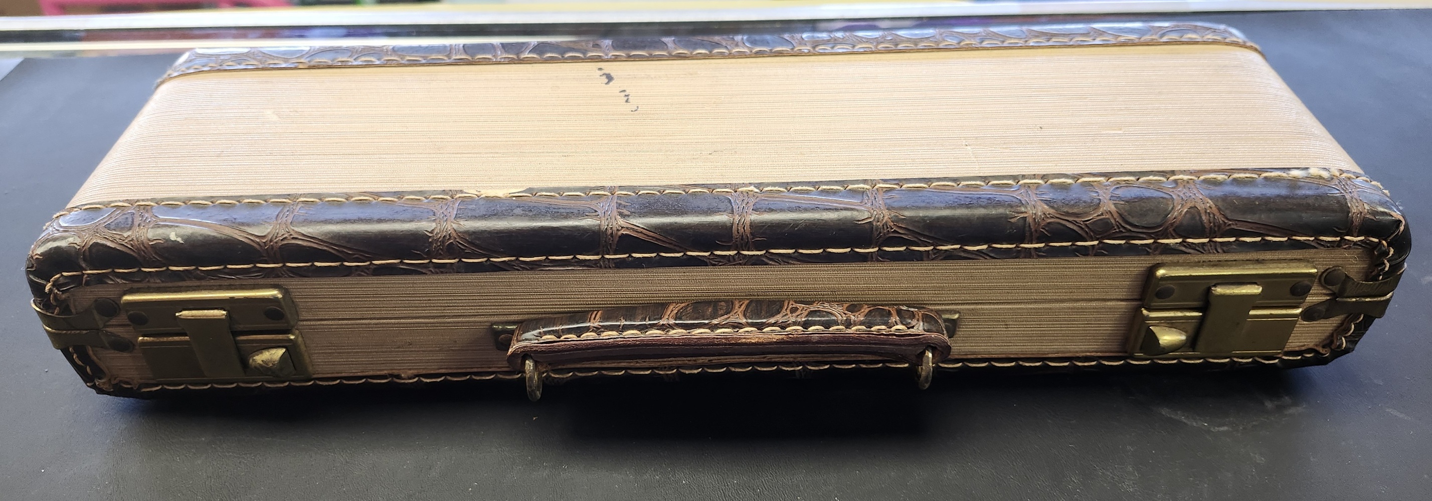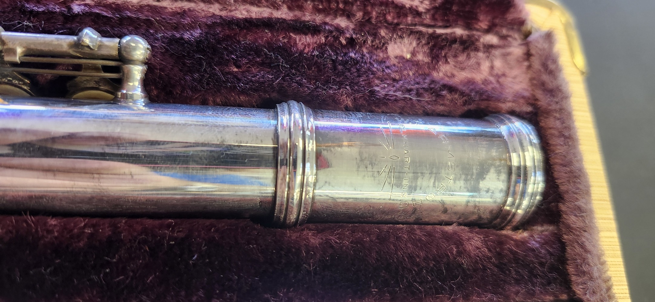 Vintage Armstrong flute made in Elkhart, Indiana. Features closed-hole keys, inline G, and C foot joint. Comes in the original hard case with purple velvet interior. The flute shows some tarnish and light wear from age but overall looks solid. Pads may need cleaning or adjustment before playing. Great piece for restoration, display, or student use.