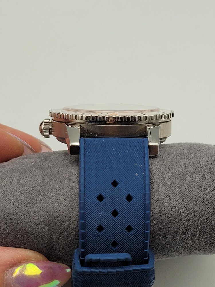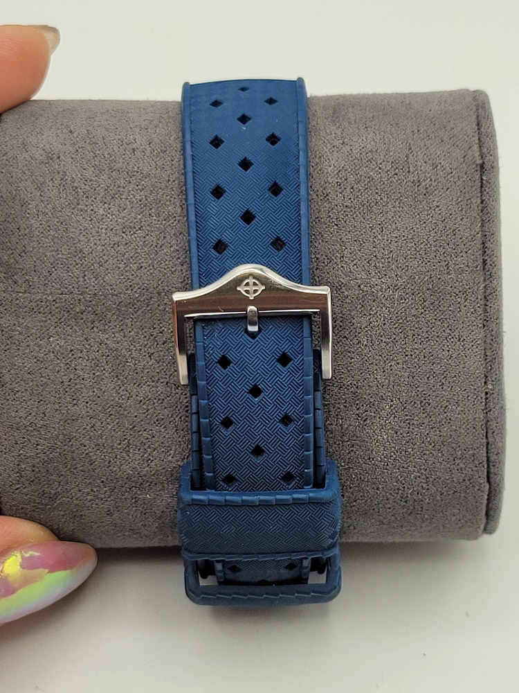 • Textured blue rubber strap w/ signed buckle