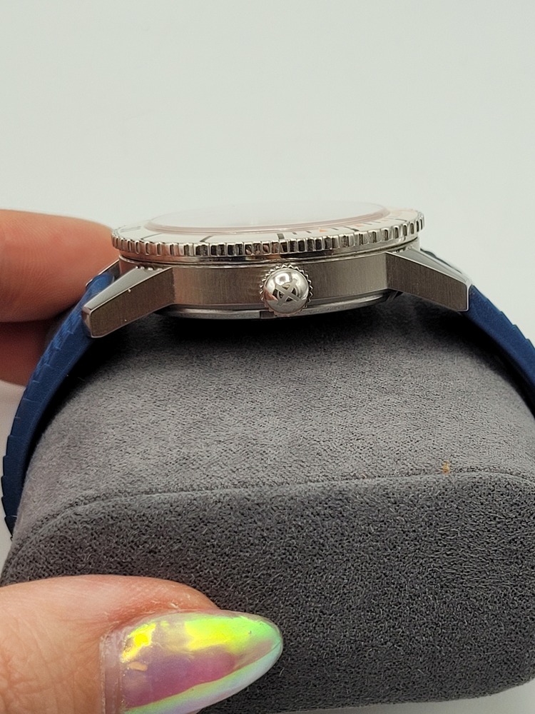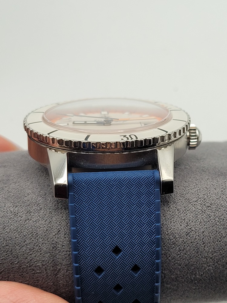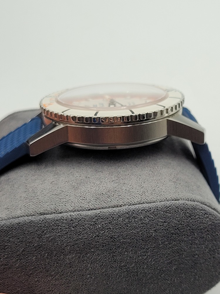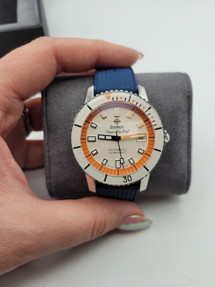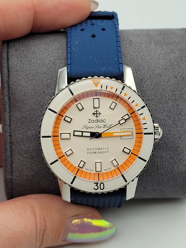 This stunning Zodiac Super Sea Wolf automatic is a total standout with its retro-inspired cream dial, bold orange accents, and domed crystal. The stainless steel case is beautifully brushed, paired with a sporty textured blue rubber strap and Zodiac-signed buckle. Swiss-made automatic movement, unidirectional bezel, and a 200m/660ft water resistance rating make it a legit dive watch with serious style.